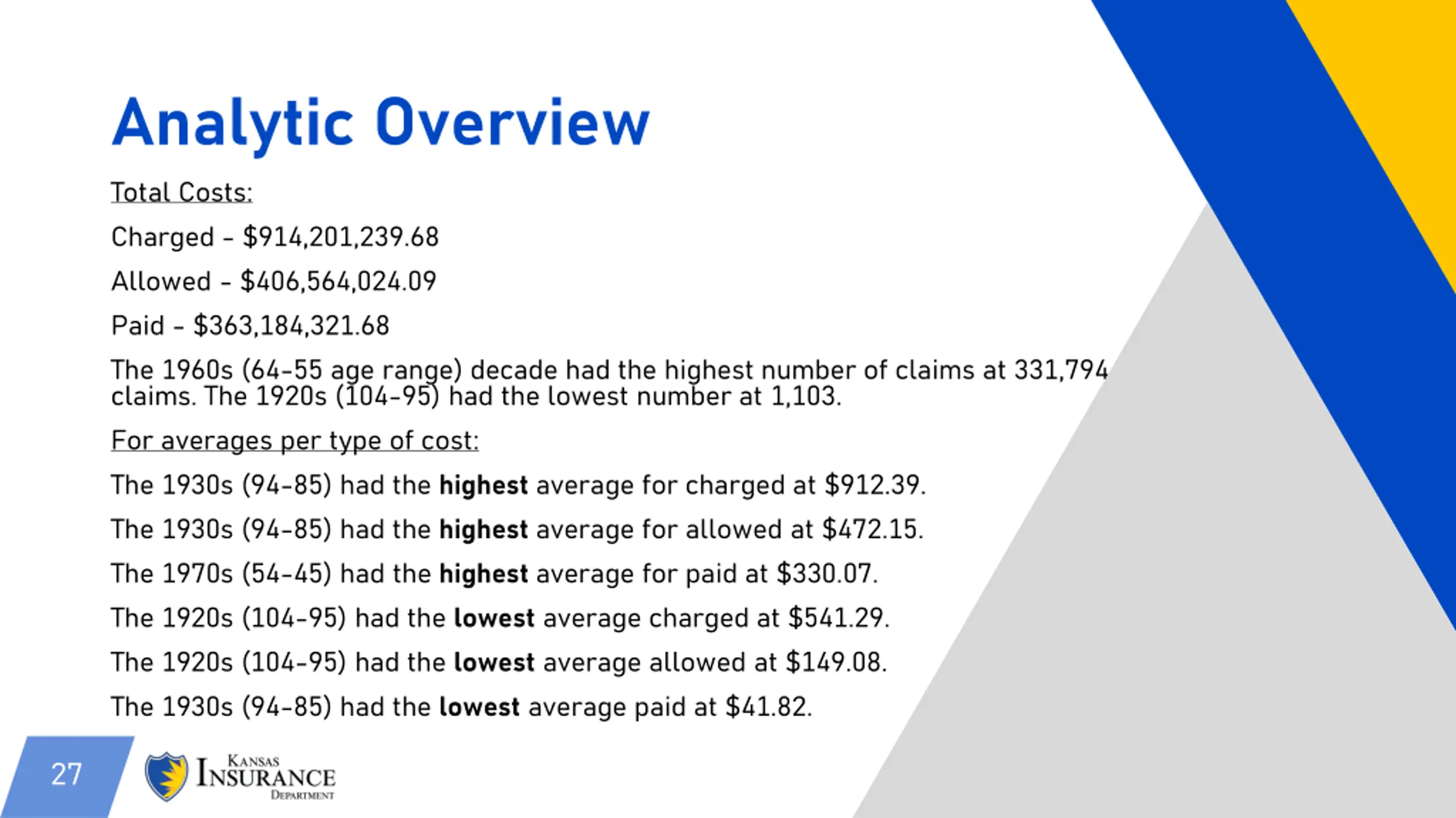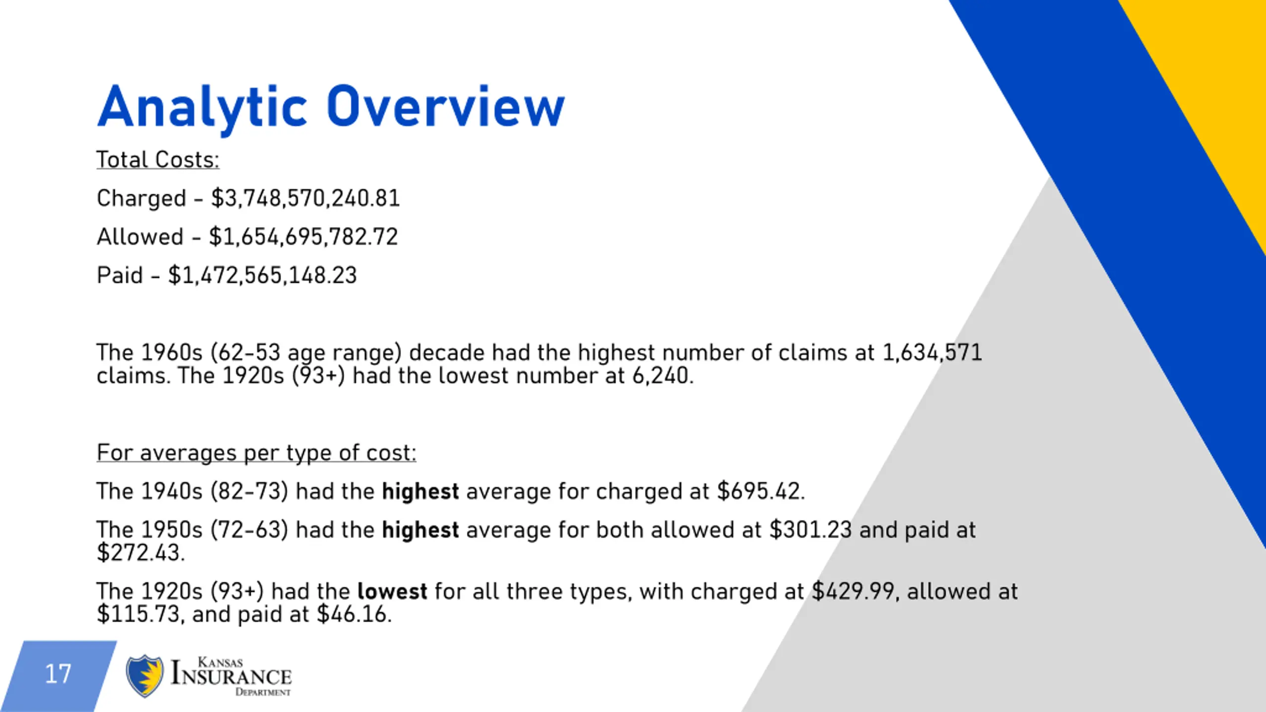Analytic Overview Total Costs: Charged - $3,748,570,240.81 Allowed - $1,654,695,782.72 Paid - $1,472,565,148.23 The 1960s (62-53 age range) decade had the highest number of claims at 1,634,571 claims. The 1920s (93+) had the lowest number at 6,240. For averages per type of cost: The 1940s (82-73) had the highest average for charged at $695.42. The 1950s (72-63) had the highest average for both allowed at $301.23 and paid at $272.43. The 1920s (93+) had the lowest for all three types, with charged at $429.99, allowed at $115.73, and paid at $46.16. 17