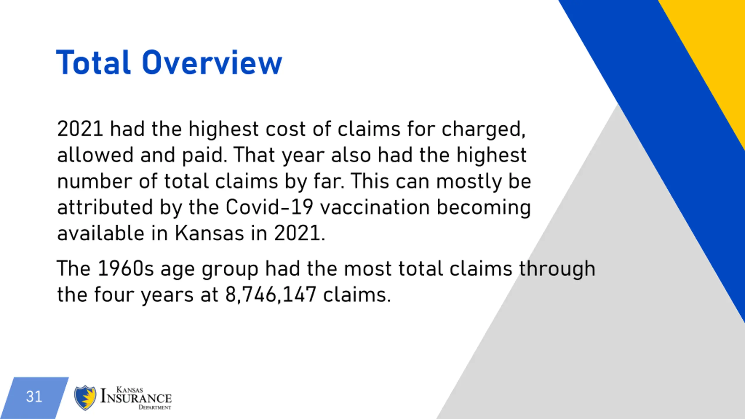 Total Overview 2021 had the highest cost of claims for charged, allowed and paid. That year also had the highest number of total claims by far. This can mostly be attributed by the Covid-19 vaccination becoming available in Kansas in 2021. The 1960s age group had the most total claims through the four years at 8,746,147 claims. 31