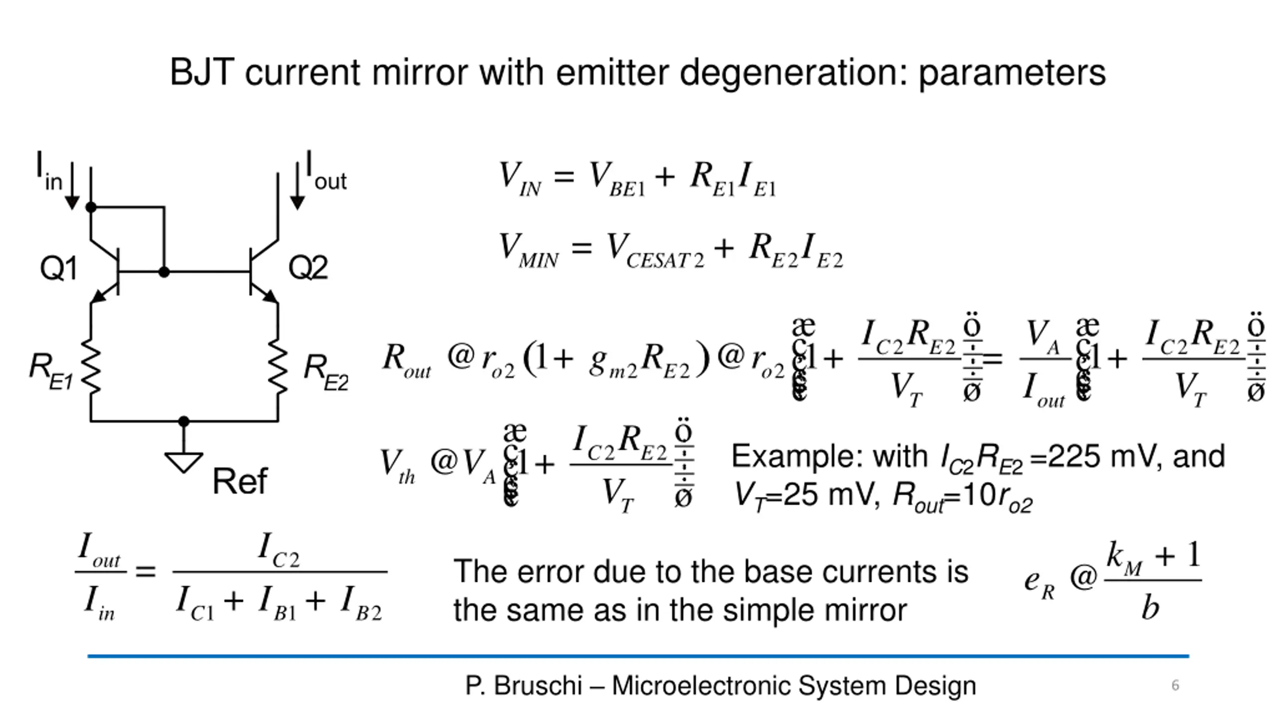 Simple mirror with emitter degeneration to increase the output resistance I I I I A A area area = 2 C = = = 2 S k 2 2 E M 1 C 1 1 1 S E V V I R I R = = for Vin=Vout, only if: 1 2 1 1 2 2 BE BE E E E E 1 I I R R I I = + V V R I = = = 1 CE 2 1 E E 1 1 1 IN BE V E + E R I k 1 2 2 E E CE M = V 2 2 2 MIN CESAT E E The voltage drop across RE1 (RE2) makes VINand VMINworse than in the simple mirror I R ( ) @ 1 + @ 1 + 2 V 2 C E R r g R r 2 2 2 2 out o m E o T P. Bruschi Microelectronic System Design 5