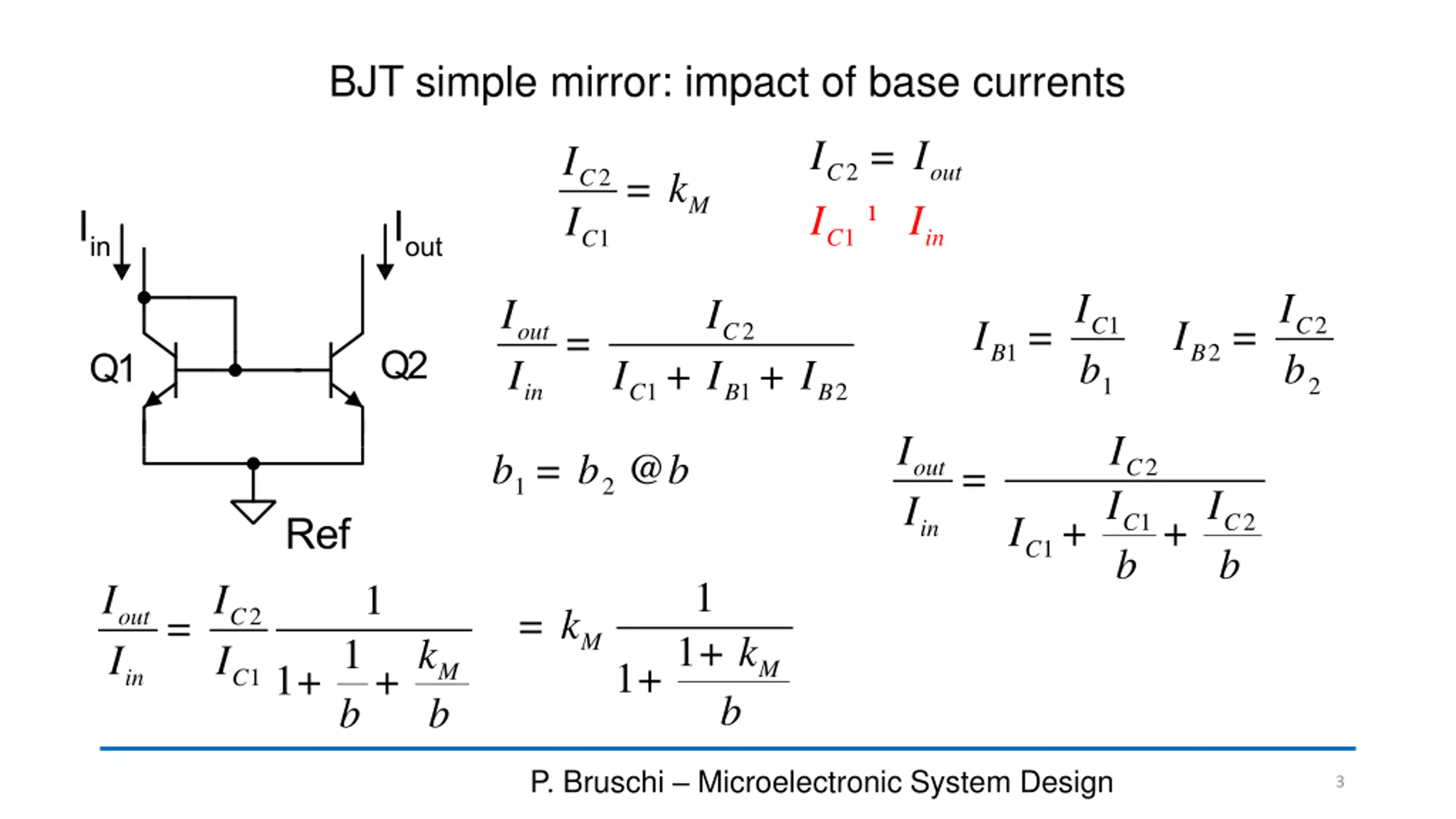 BJT simple mirror: impact of base currents = I I I I I 2 C out = 2 C k M I 1 C i n 1 C I b I b I I I = = 1 2 C C I I = 2 out I C 1 2 B B + + I I 1 2 1 1 2 in C B B I I I = 2@ b b b = 2 out I C 1 I + + I 1 2 C b C b in 1 C 1 + 1 I I I = k = 2 out I C 1 M k 1 b k 1 + M 1 + + M b 1 in C b P. Bruschi Microelectronic System Design 3