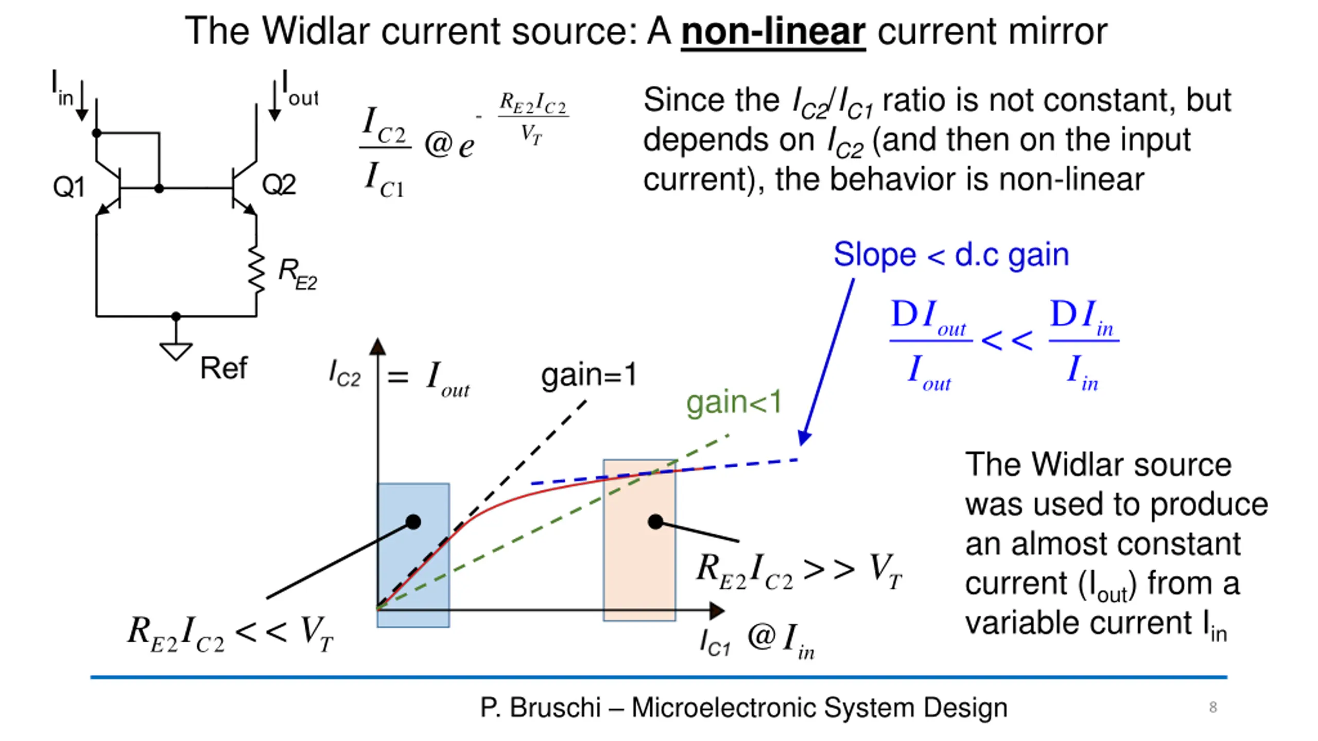 The Widlar current source = + V V R I 1 2 2 2 BE BE E E D @ - = @ V V V R I R I 1 2 2 2 2 2 BE BE BE E E E C V V V BE V BE V I I = 1 + @ 2 CB V I I e I e @ ln C V V T T C S S BE T A S I I I I I I I I D @ ln - ln = ln 1 2 1 2 C C C S V V V V BE T T T 1 2 1 2 S S S C R I I I 2 2 E C - I I V @ 2 C e @ R I D @ ln 1 C V V T If Q1=Q2 (IS1=IS2) 2 2 E C BE T 1 C 2 C P. Bruschi Microelectronic System Design 7