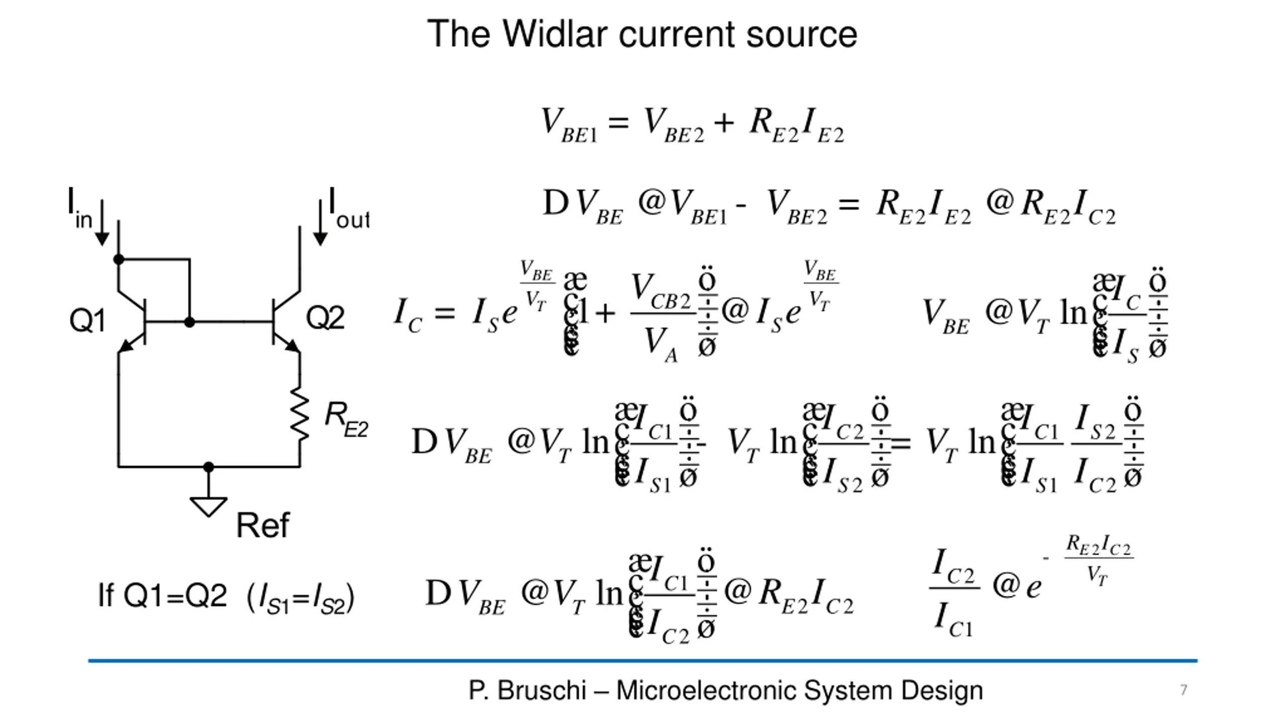 BJT current mirror with emitter degeneration: parameters = + V V R I 1 1 1 IN BE E E = + V CESAT V R I 2 2 2 MIN E E I R I R V I ( ) @ 1 + @ 1 + = 1 + 2 V 2 2 V 2 C E C E R r g R r A 2 2 2 2 out o m E o T out T I R Example: with IC2RE2 =225 mV, and VT=25 mV, Rout=10ro2 @ 1 + 2 V 2 C E V V th A T I I I + 1 k = 2 out I C The error due to the base currents is the same as in the simple mirror @ e M + + I I R b 1 1 2 in C B B P. Bruschi Microelectronic System Design 6