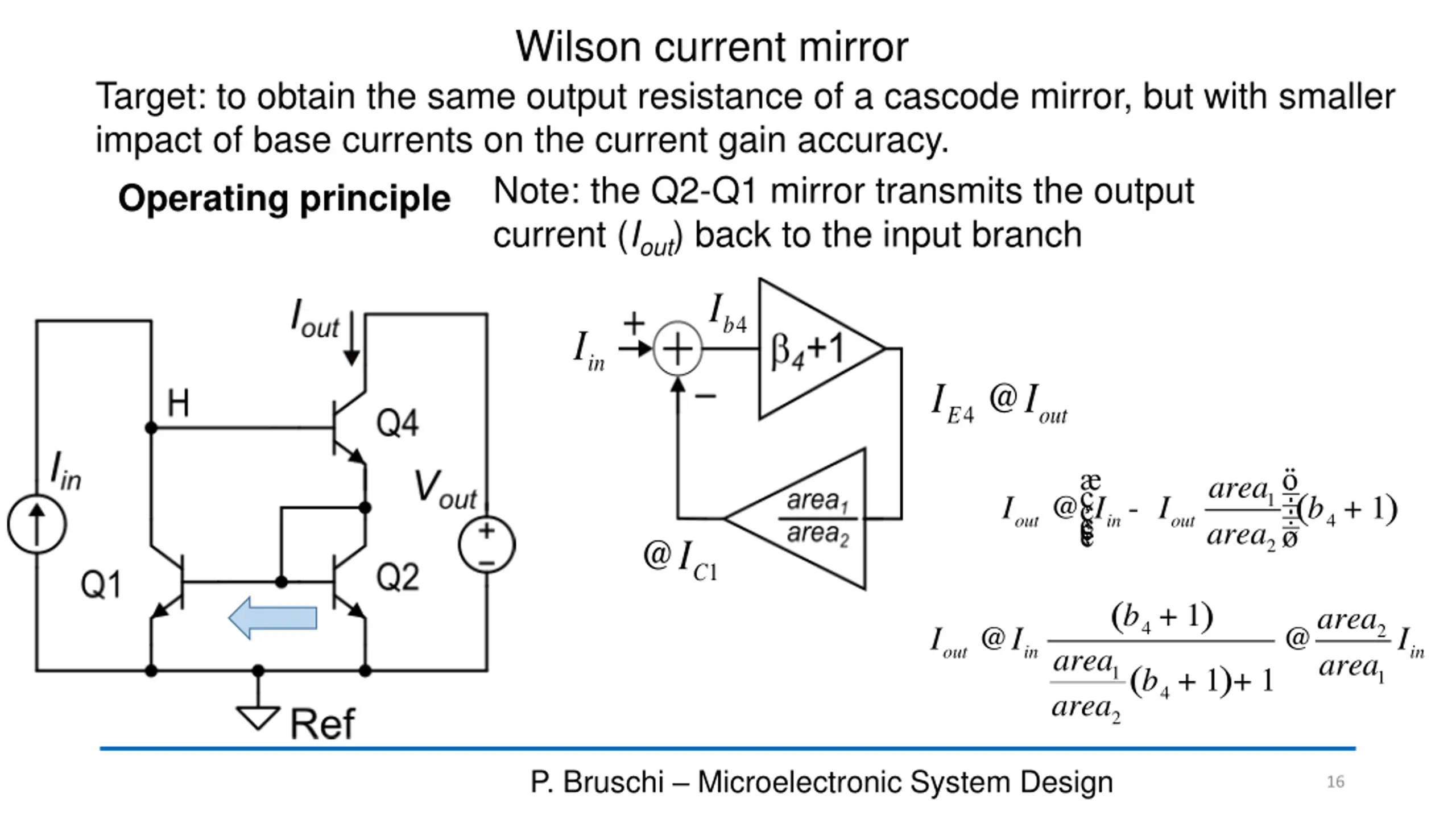 BJT cascode current mirror: Rout BI 4 ( ) @ 1 + r r h 4 4 v o fe ? be r 4 It can be shown that: There is interaction of the output branch (Q2,Q4) with the input one (Q3,Q4) caused by the base currents. This interaction is not present in the cascode MOSFET h 4 f e @ 41 + R r out o 2 P. Bruschi Microelectronic System Design 10