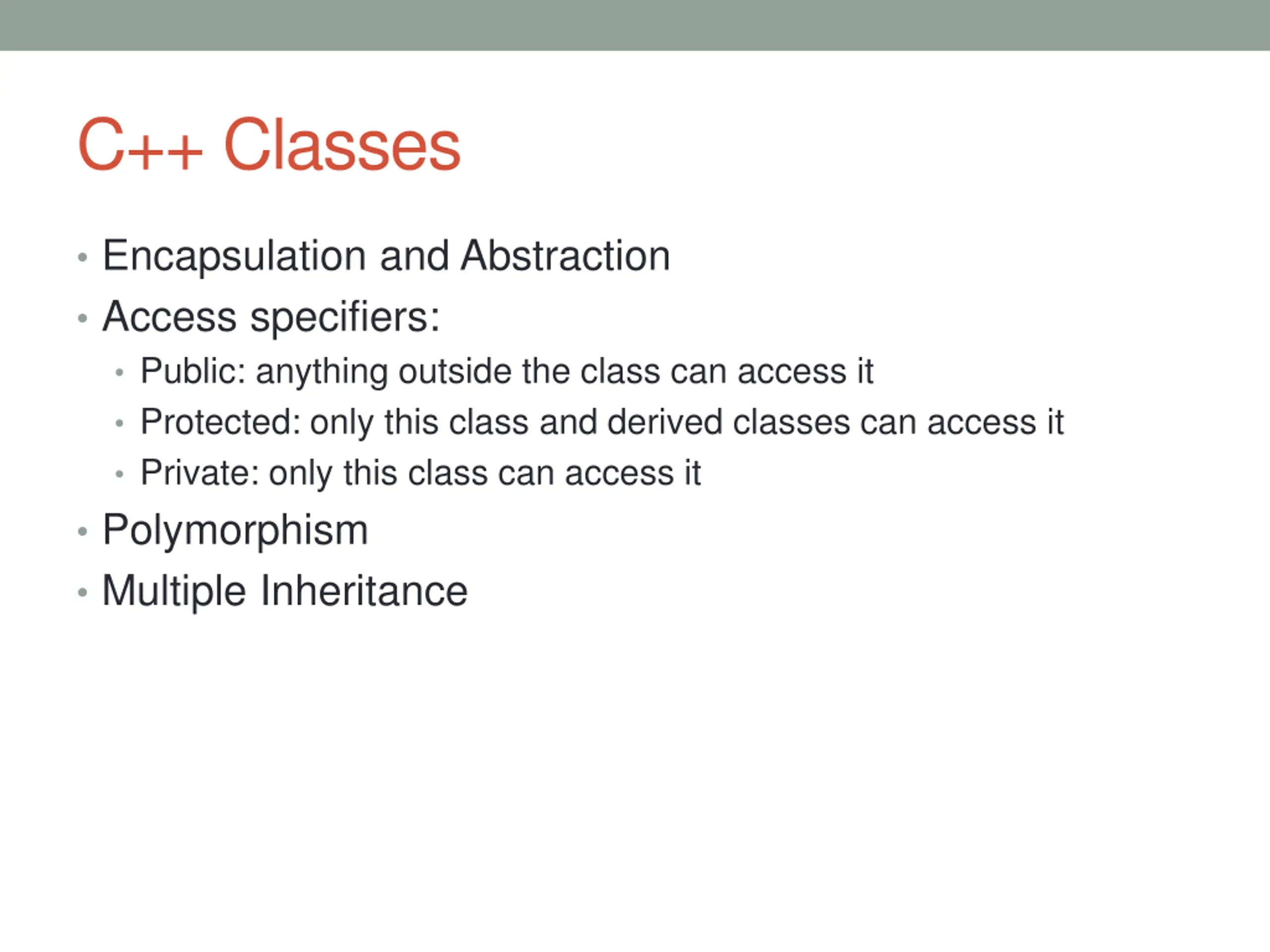 C++ Classes Encapsulation and Abstraction Access specifiers: Public: anything outside the class can access it Protected: only this class and derived classes can access it Private: only this class can access it Polymorphism Multiple Inheritance