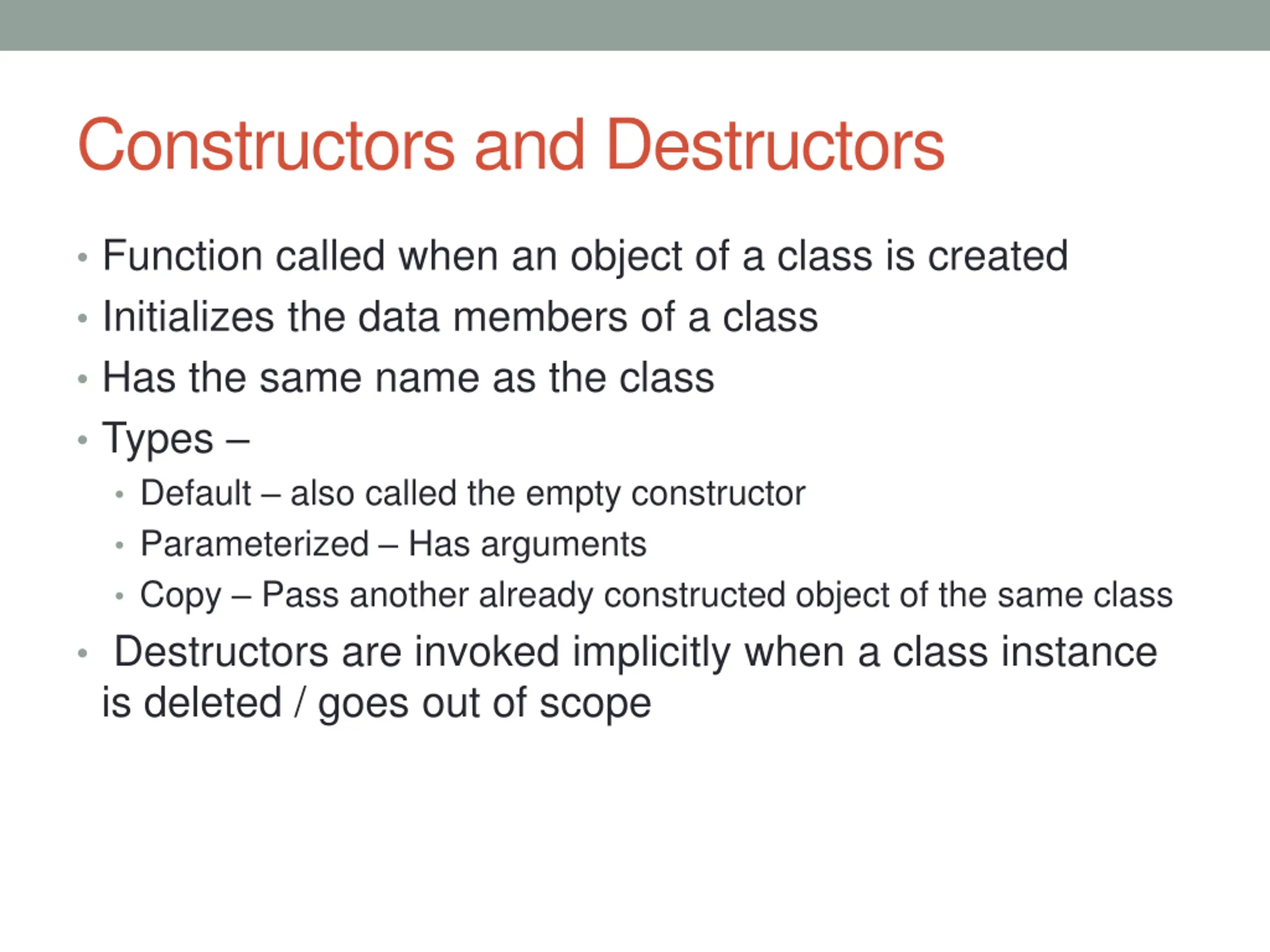 Constructors and Destructors Function called when an object of a class is created Initializes the data members of a class Has the same name as the class Types Default also called the empty constructor Parameterized Has arguments Copy Pass another already constructed object of the same class Destructors are invoked implicitly when a class instance is deleted / goes out of scope
