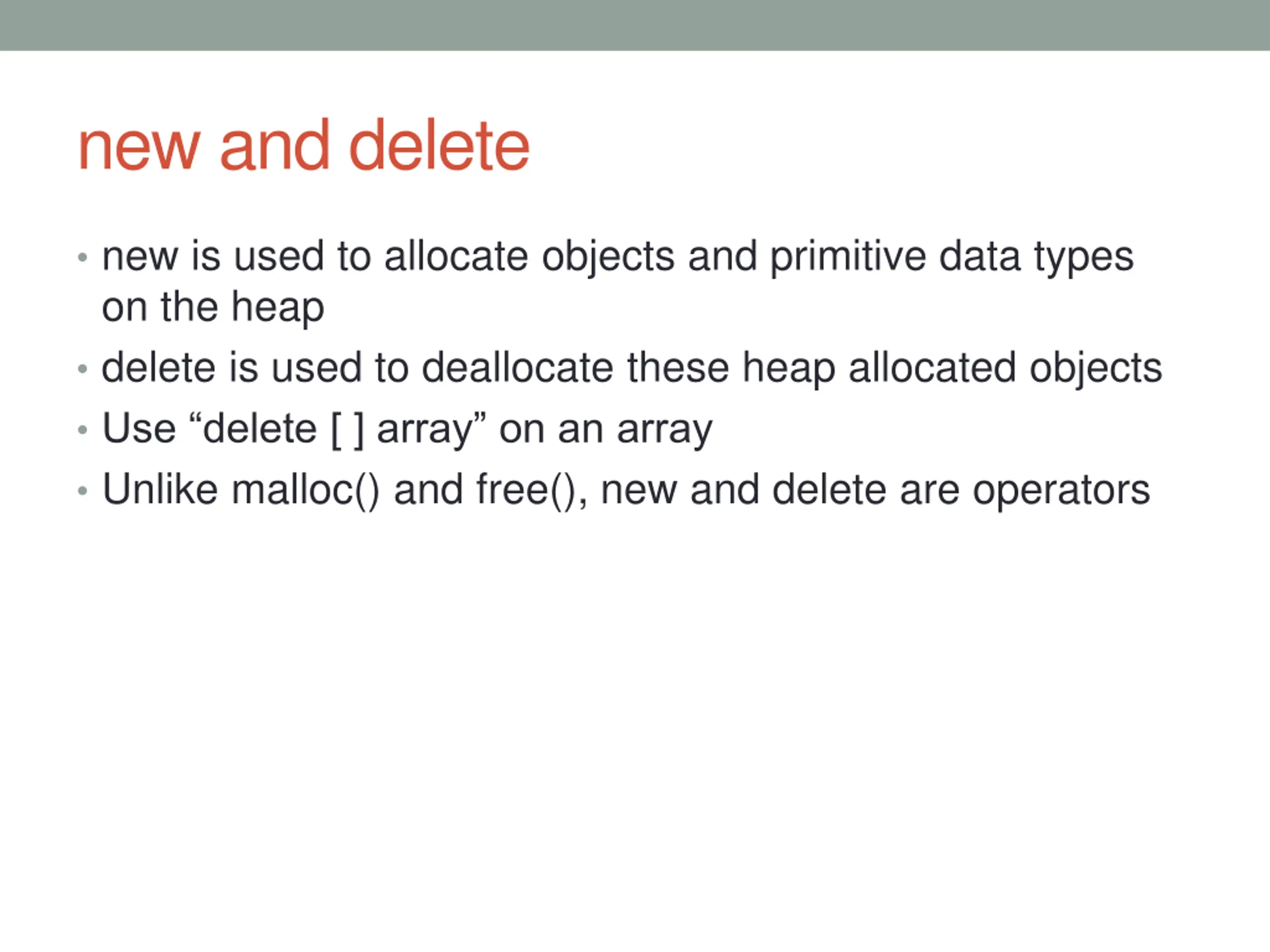 new and delete new is used to allocate objects and primitive data types on the heap delete is used to deallocate these heap allocated objects Use delete [ ] array on an array Unlike malloc() and free(), new and delete are operators