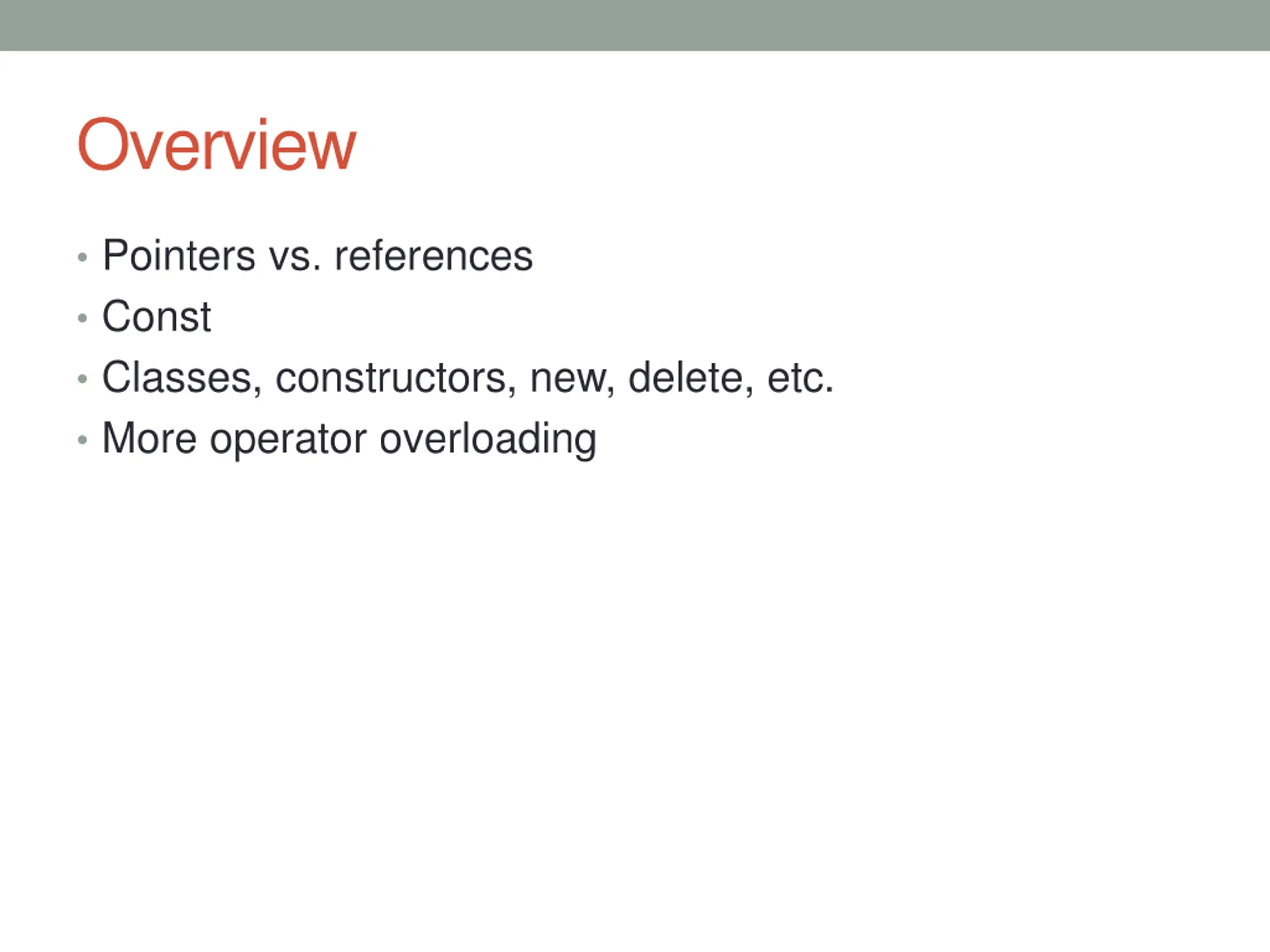 Overview Pointers vs. references Const Classes, constructors, new, delete, etc. More operator overloading
