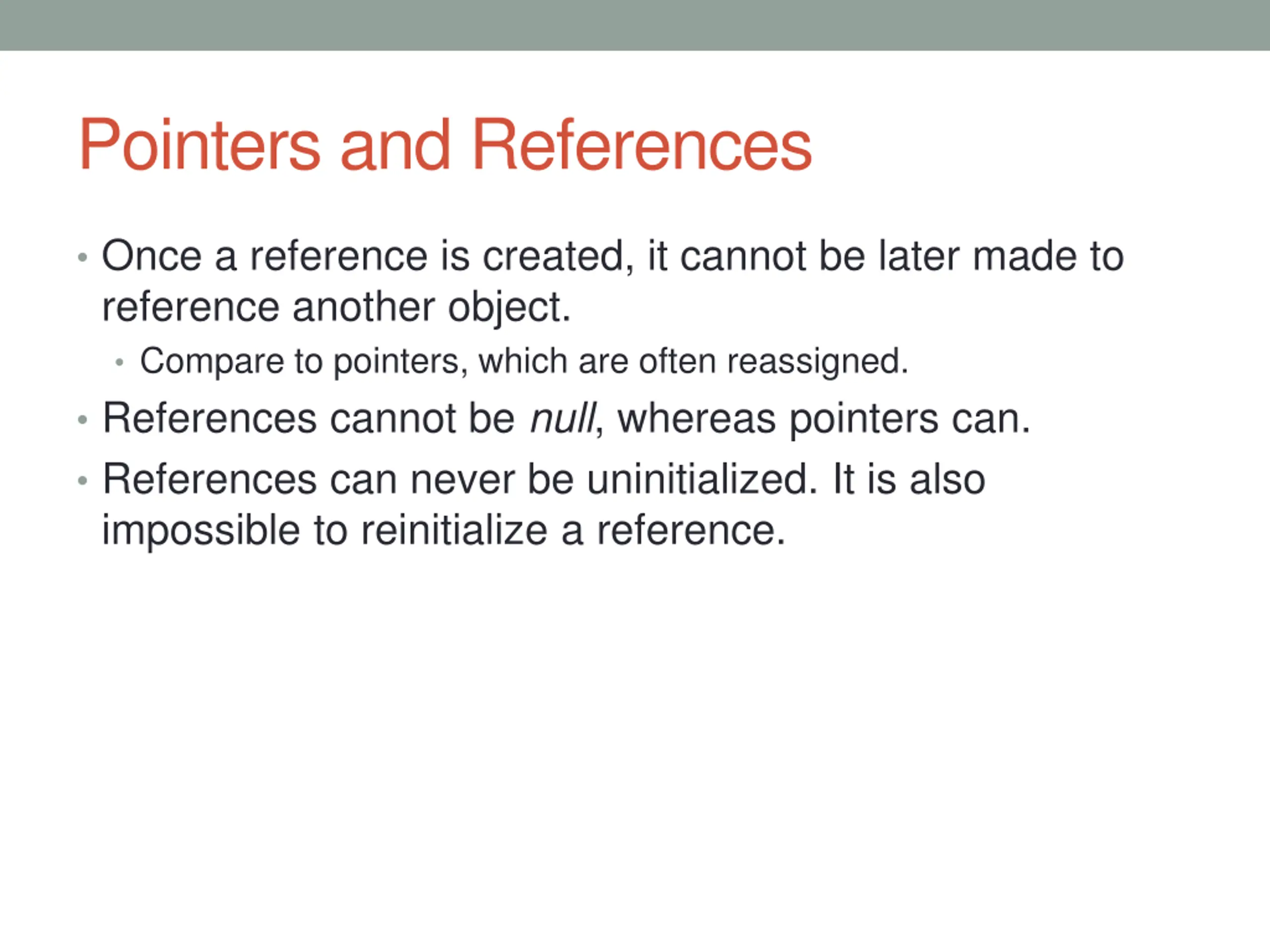 Pointers and References Once a reference is created, it cannot be later made to reference another object. Compare to pointers, which are often reassigned. References cannot be null, whereas pointers can. References can never be uninitialized. It is also impossible to reinitialize a reference.