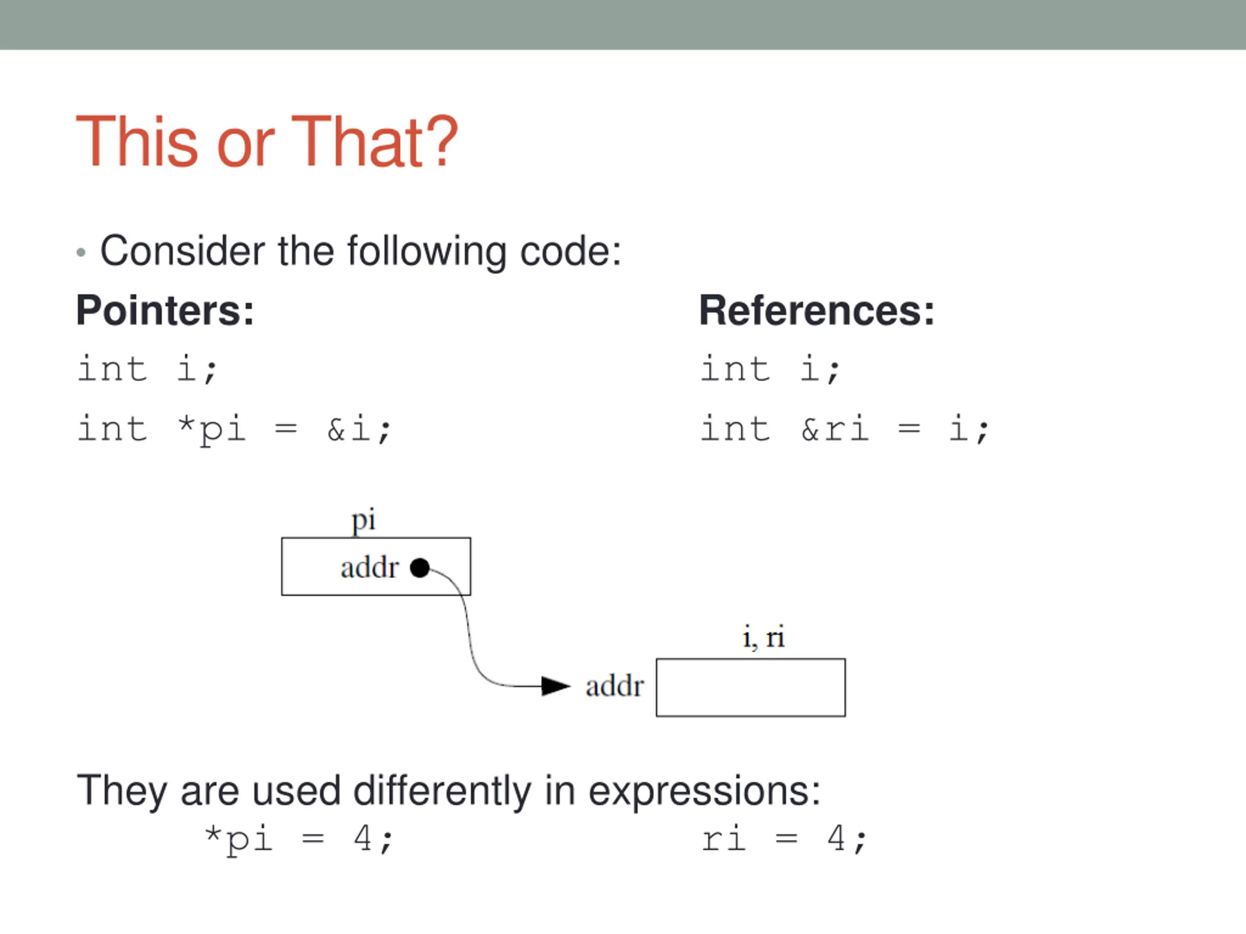 This or That? Consider the following code: Pointers: int i; int *pi = &i; References: int i; int &ri = i; They are used differently in expressions: *pi = 4; ri = 4;