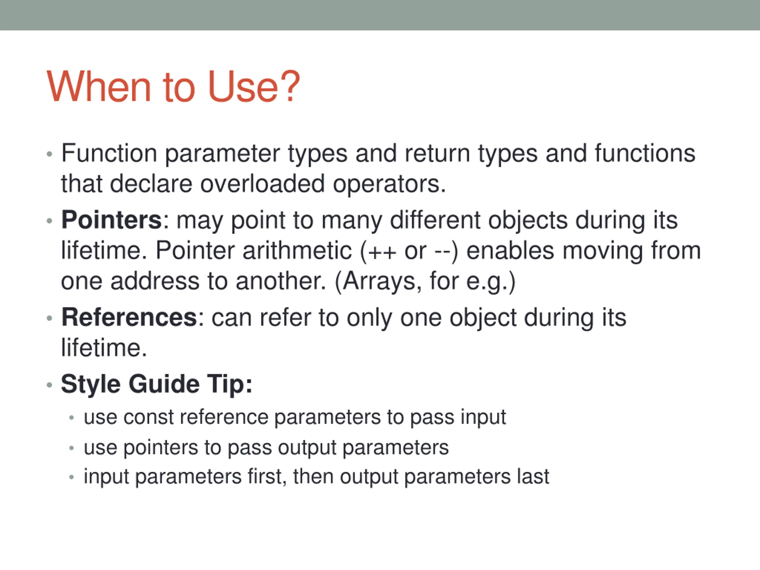 When to Use? Function parameter types and return types and functions that declare overloaded operators. Pointers: may point to many different objects during its lifetime. Pointer arithmetic (++ or --) enables moving from one address to another. (Arrays, for e.g.) References: can refer to only one object during its lifetime. Style Guide Tip: use const reference parameters to pass input use pointers to pass output parameters input parameters first, then output parameters last