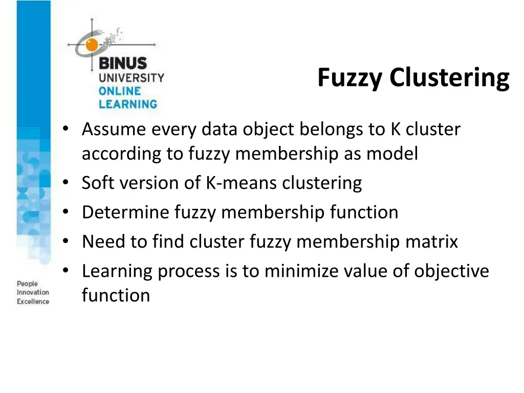 Fuzzy Clustering Assume every data object belongs to K cluster according to fuzzy membership as model Soft version of K-means clustering Determine fuzzy membership function Need to find cluster fuzzy membership matrix Learning process is to minimize value of objective function