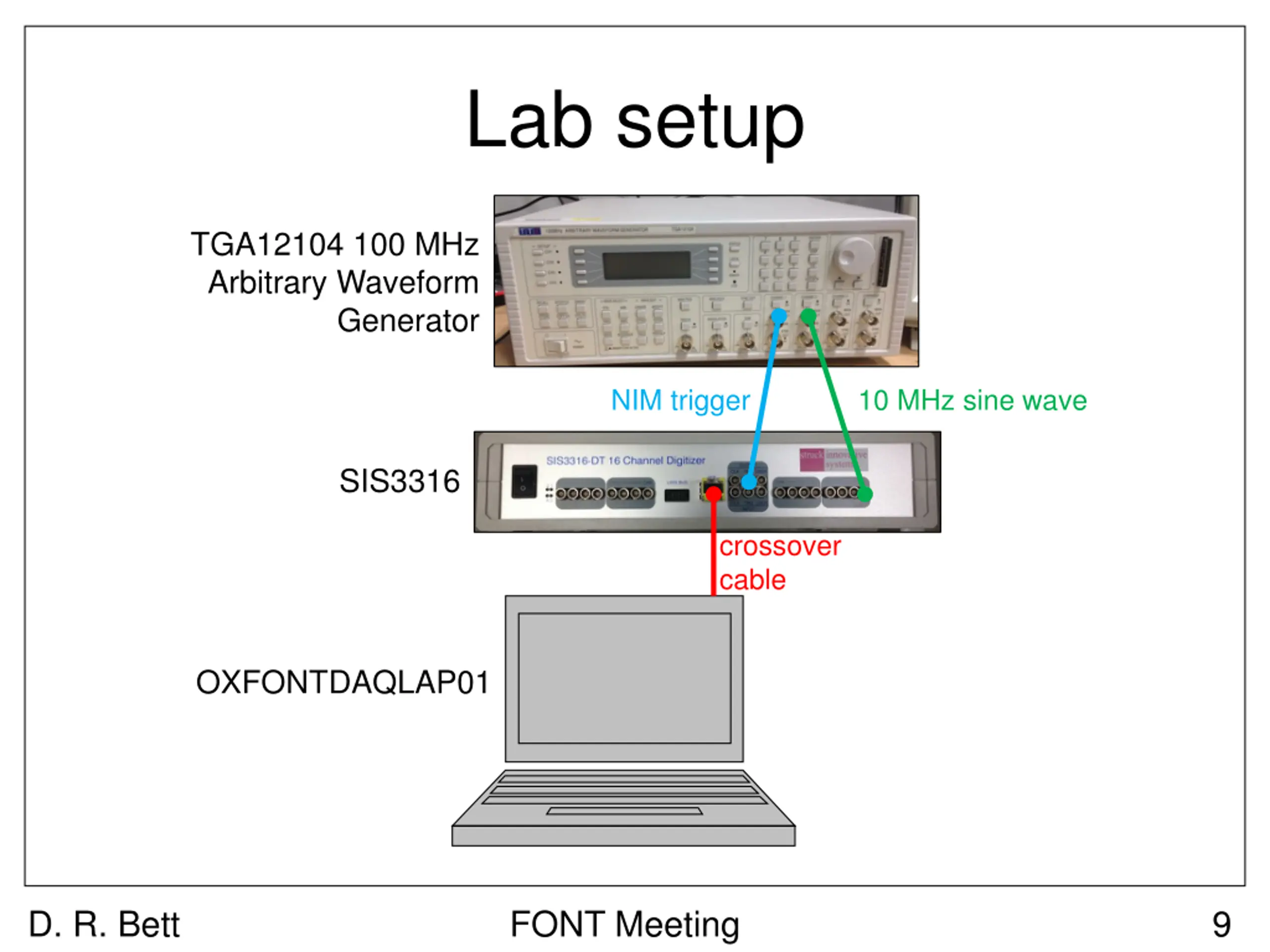 Lab setup TGA12104 100 MHz Arbitrary Waveform Generator NIM trigger 10 MHz sine wave SIS3316 crossover cable OXFONTDAQLAP01 D. R. Bett FONT Meeting 9