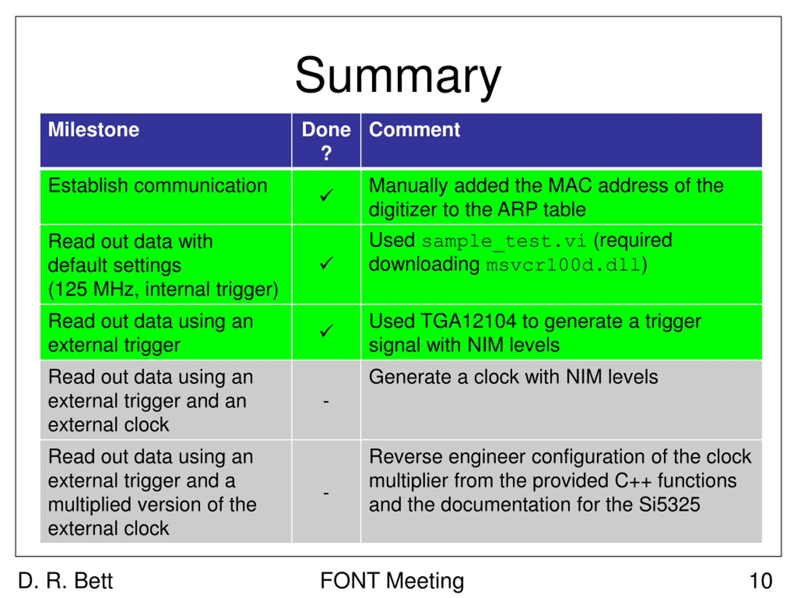 Summary Milestone Done ? Comment Establish communication Manually added the MAC address of the digitizer to the ARP table Used sample_test.vi (required downloading msvcr100d.dll) Read out data with default settings (125 MHz, internal trigger) Read out data using an external trigger Read out data using an external trigger and an external clock Read out data using an external trigger and a multiplied version of the external clock Used TGA12104 to generate a trigger signal with NIM levels Generate a clock with NIM levels - Reverse engineer configuration of the clock multiplier from the provided C++ functions and the documentation for the Si5325 - D. R. Bett FONT Meeting 10
