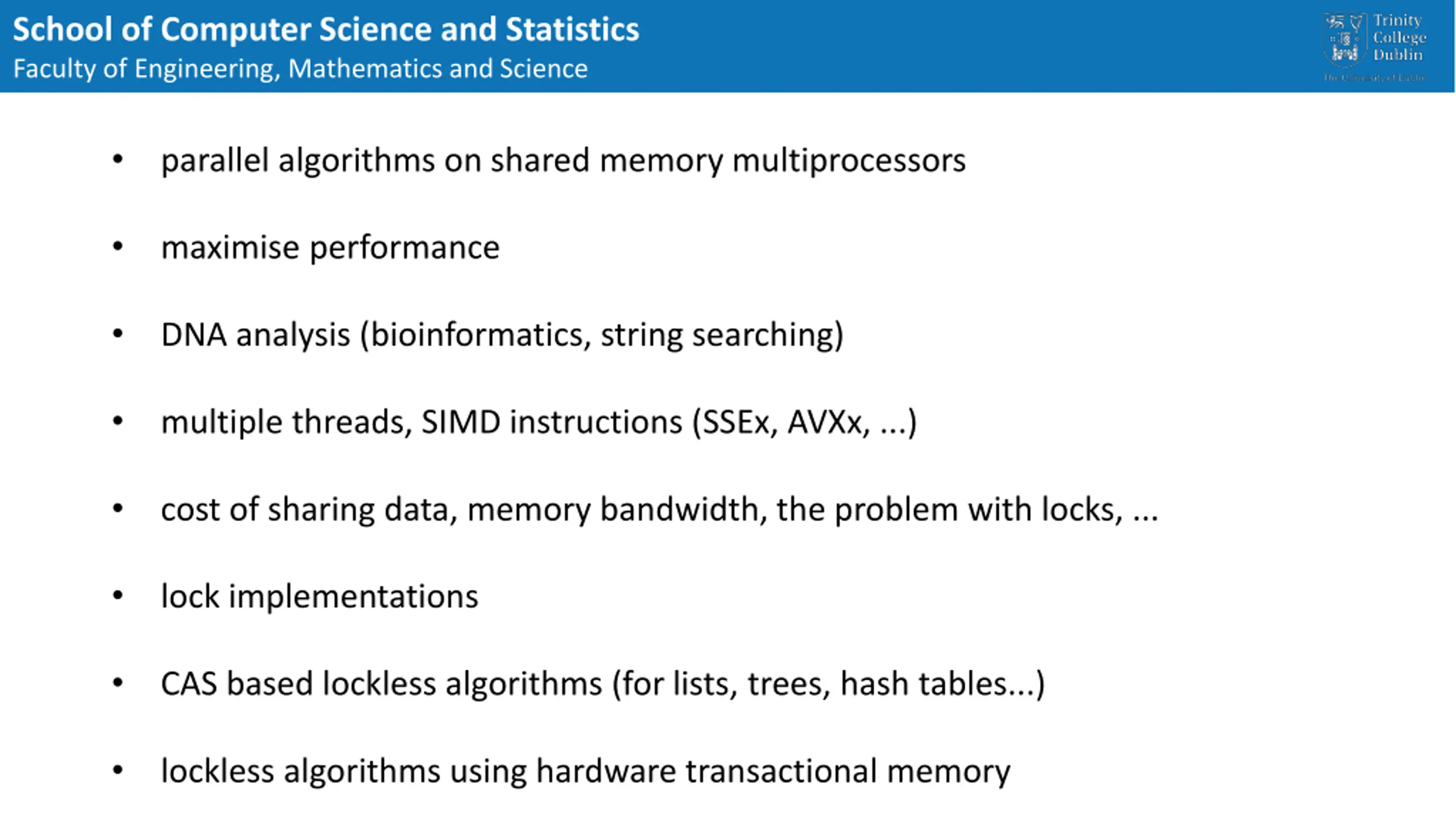 School of Computer Science and Statistics Faculty of Engineering, Mathematics and Science parallel algorithms on shared memory multiprocessors maximise performance DNA analysis (bioinformatics, string searching) multiple threads, SIMD instructions (SSEx, AVXx, ...) cost of sharing data, memory bandwidth, the problem with locks, ... lock implementations CAS based lockless algorithms (for lists, trees, hash tables...) lockless algorithms using hardware transactional memory