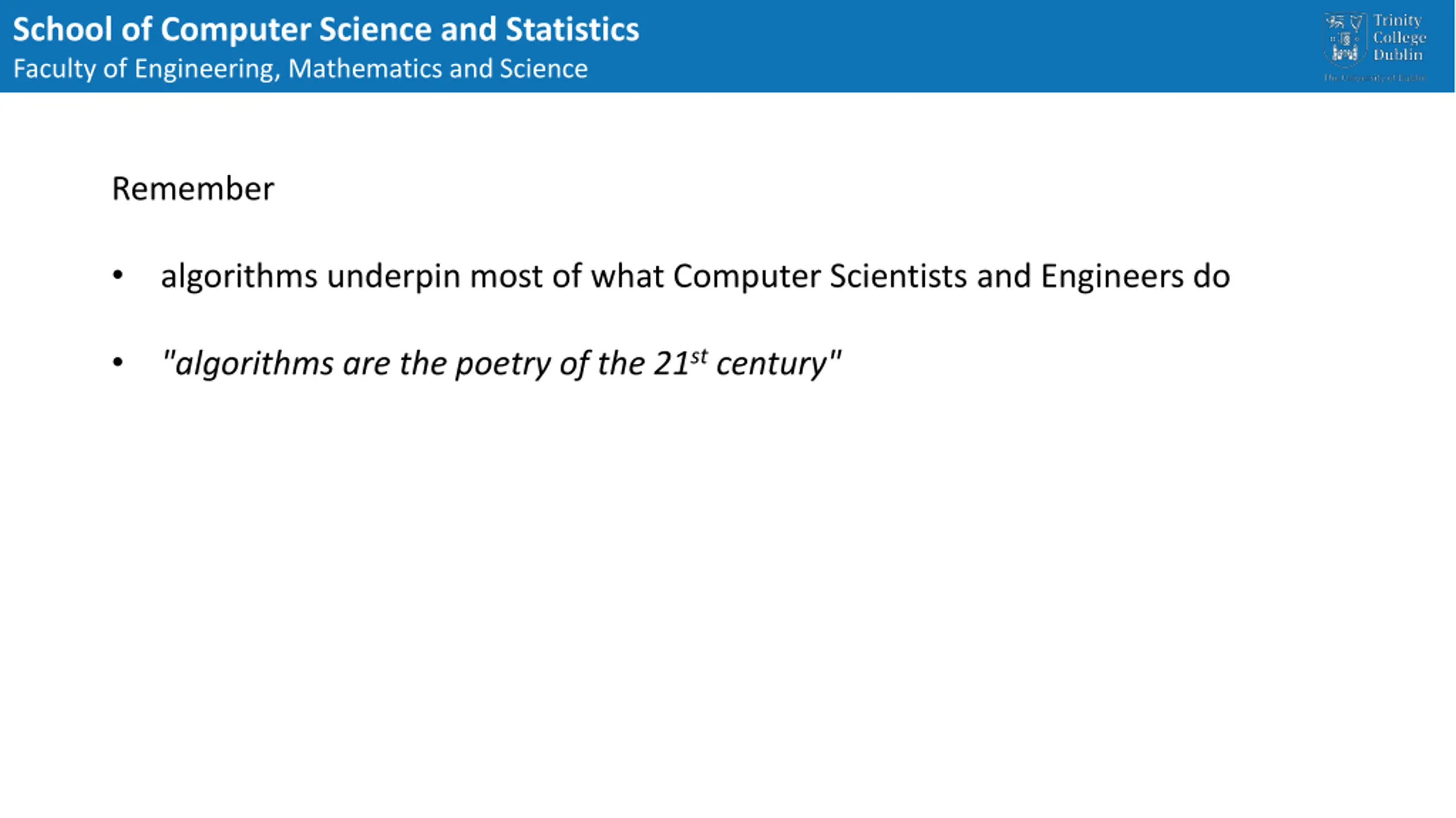 School of Computer Science and Statistics Faculty of Engineering, Mathematics and Science Remember algorithms underpin most of what Computer Scientists and Engineers do "algorithms are the poetry of the 21st century"