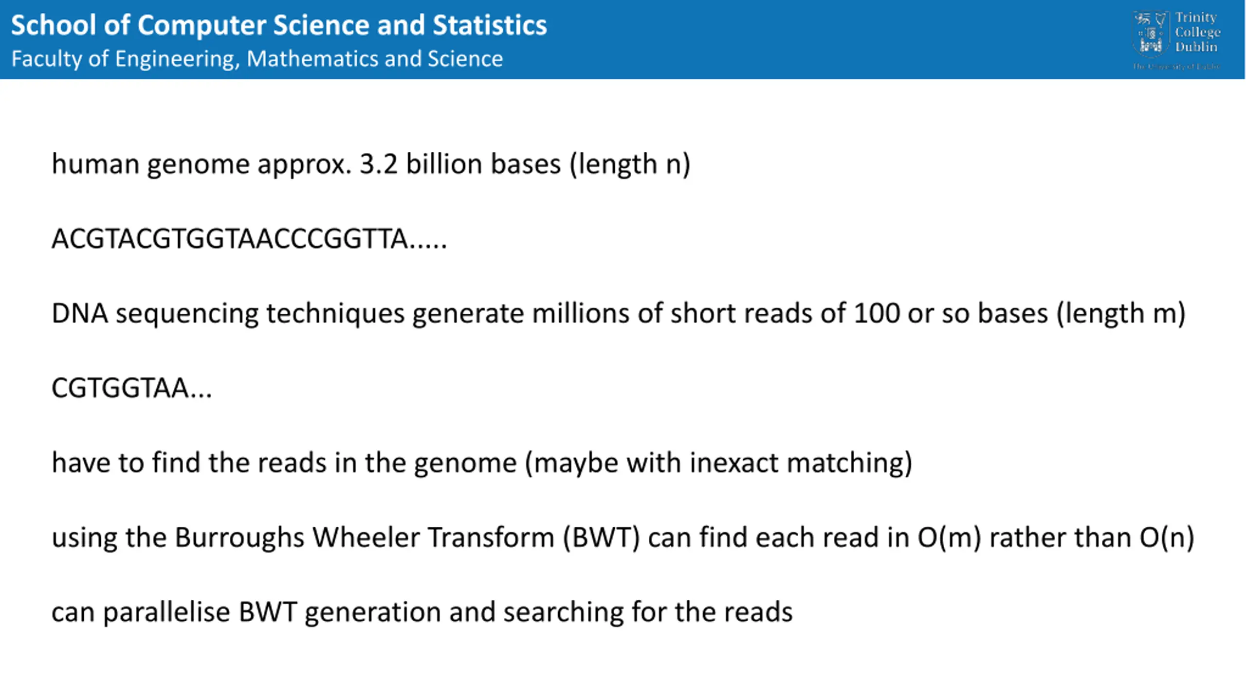 School of Computer Science and Statistics Faculty of Engineering, Mathematics and Science human genome approx. 3.2 billion bases (length n) ACGTACGTGGTAACCCGGTTA..... DNA sequencing techniques generate millions of short reads of 100 or so bases (length m) CGTGGTAA... have to find the reads in the genome (maybe with inexact matching) using the Burroughs Wheeler Transform (BWT) can find each read in O(m) rather than O(n) can parallelise BWT generation and searching for the reads