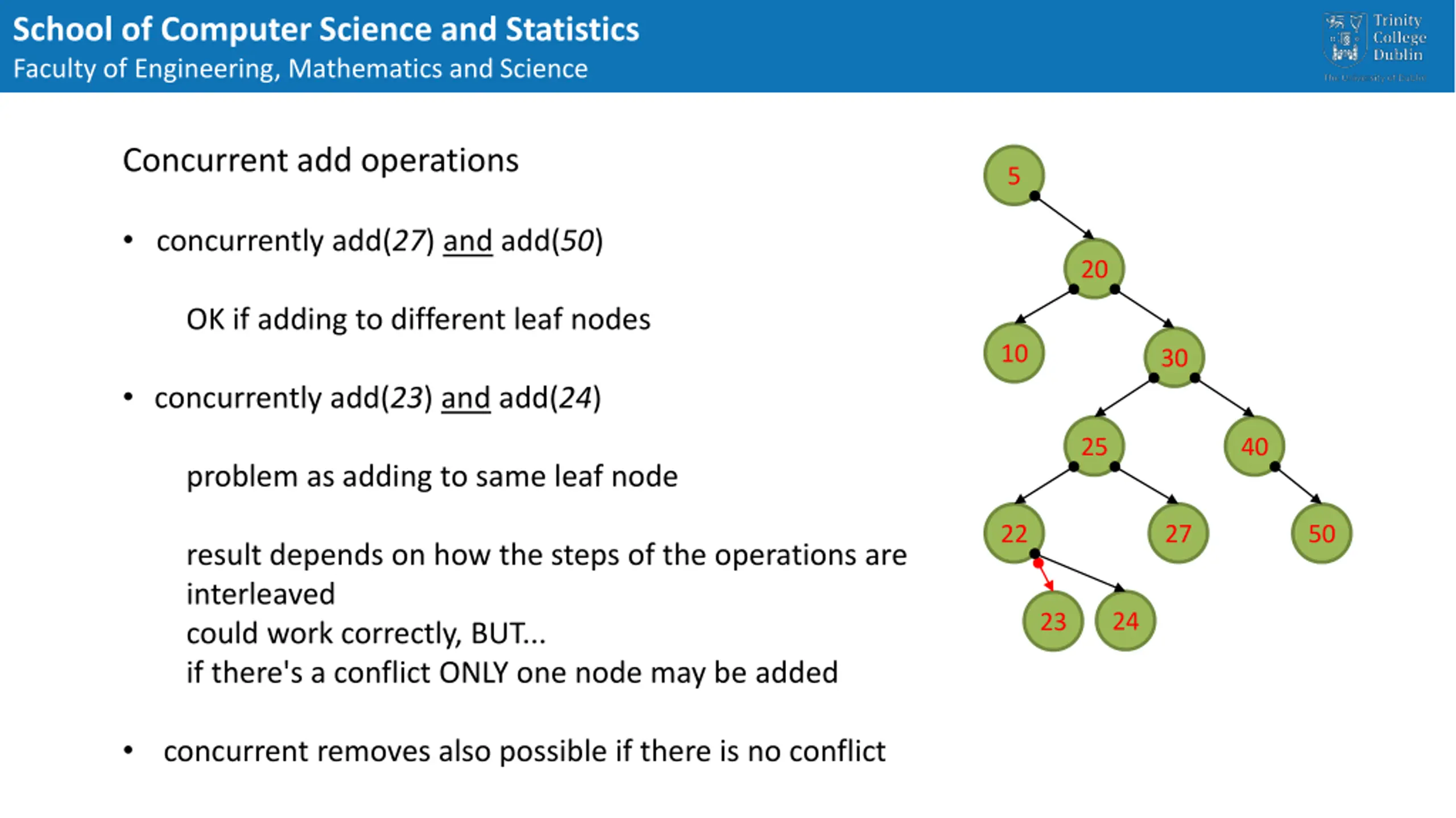 School of Computer Science and Statistics Faculty of Engineering, Mathematics and Science Concurrent add operations 5 concurrently add(27) and add(50) 20 OK if adding to different leaf nodes 10 30 concurrently add(23) and add(24) 25 40 problem as adding to same leaf node 22 27 50 result depends on how the steps of the operations are interleaved could work correctly, BUT... if there's a conflict ONLY one node may be added 24 23 concurrent removes also possible if there is no conflict