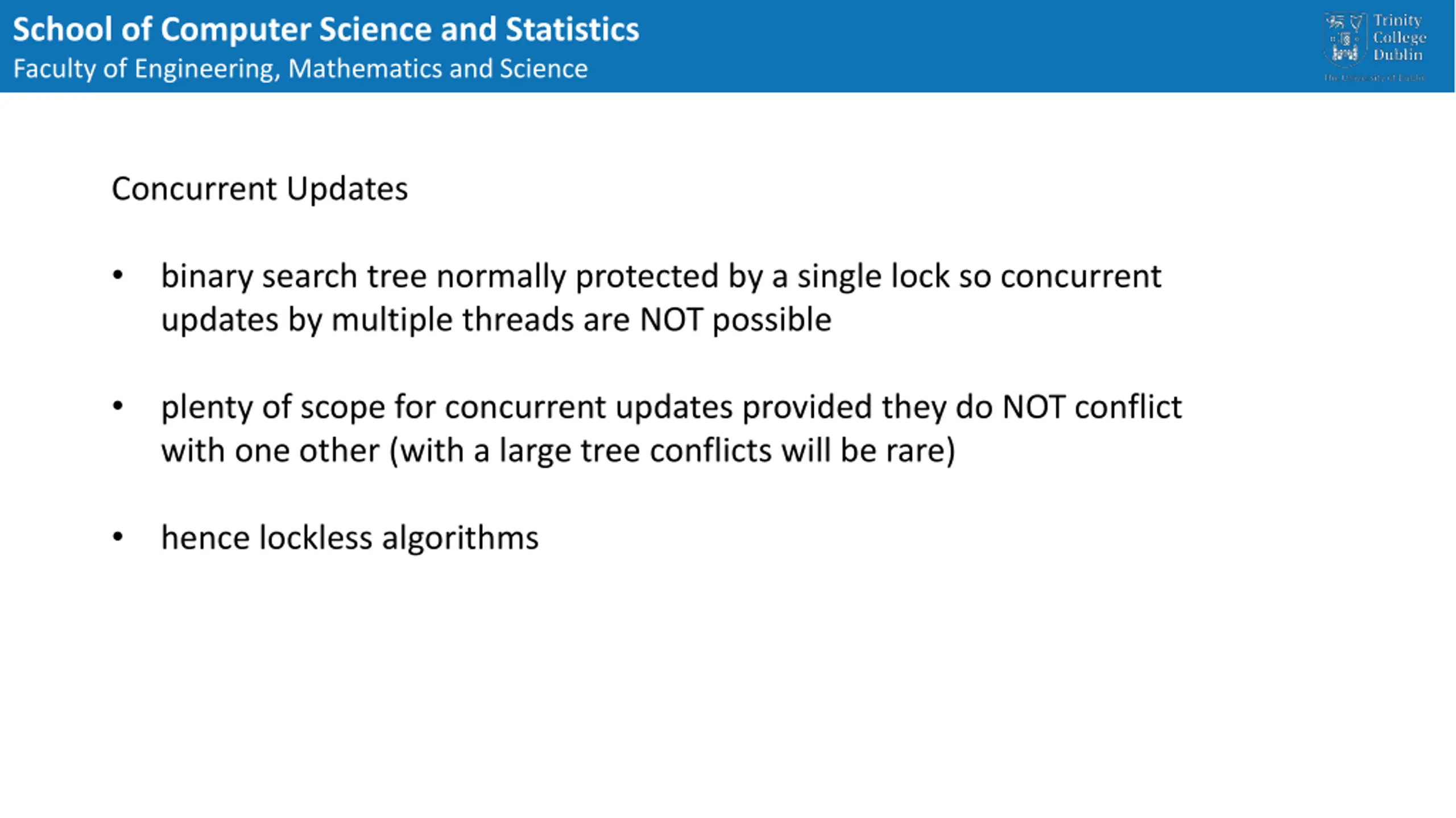 School of Computer Science and Statistics Faculty of Engineering, Mathematics and Science Concurrent Updates binary search tree normally protected by a single lock so concurrent updates by multiple threads are NOT possible plenty of scope for concurrent updates provided they do NOT conflict with one other (with a large tree conflicts will be rare) hence lockless algorithms