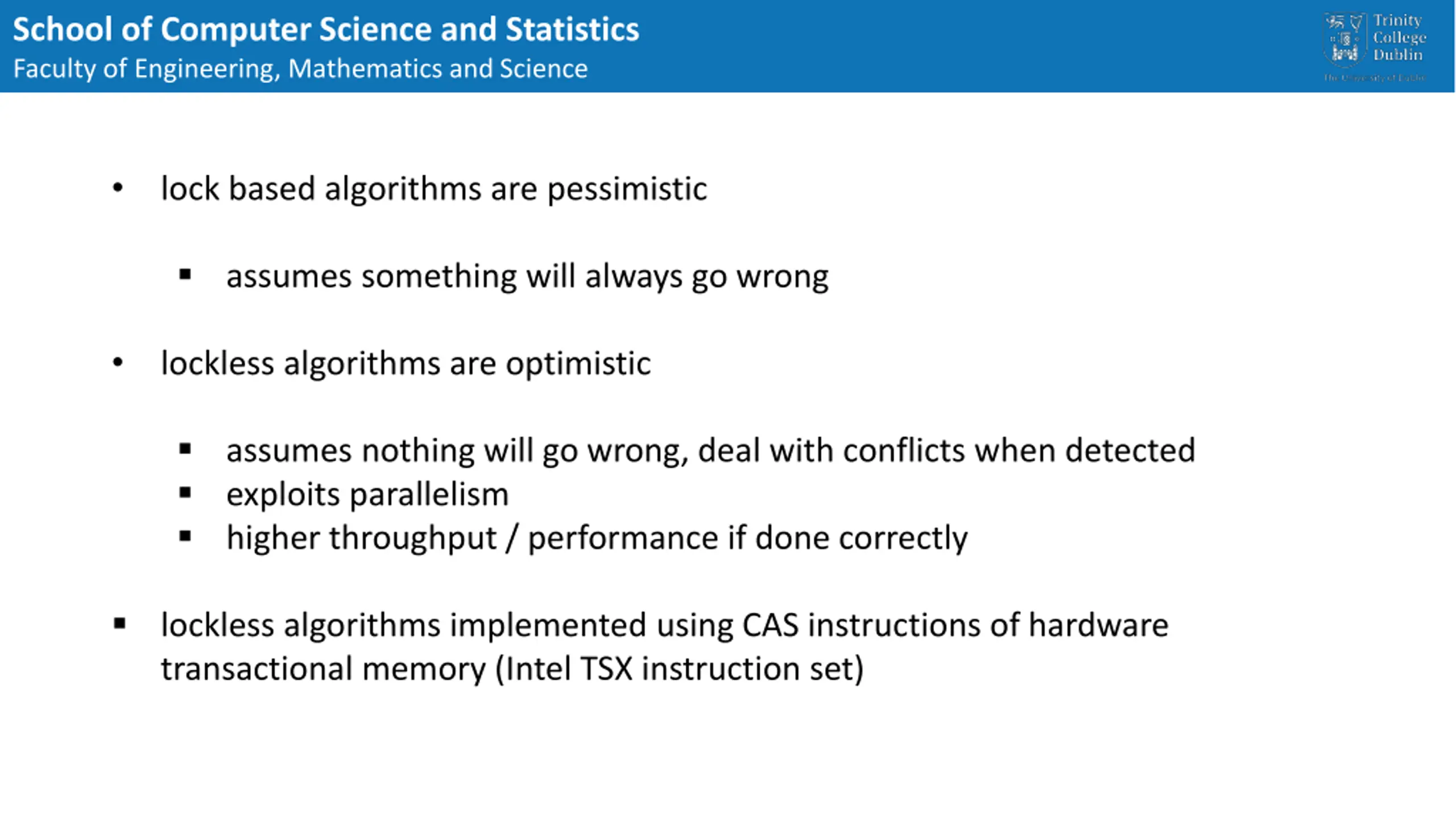 School of Computer Science and Statistics Faculty of Engineering, Mathematics and Science lock based algorithms are pessimistic assumes something will always go wrong lockless algorithms are optimistic assumes nothing will go wrong, deal with conflicts when detected exploits parallelism higher throughput / performance if done correctly lockless algorithms implemented using CAS instructions of hardware transactional memory (Intel TSX instruction set)