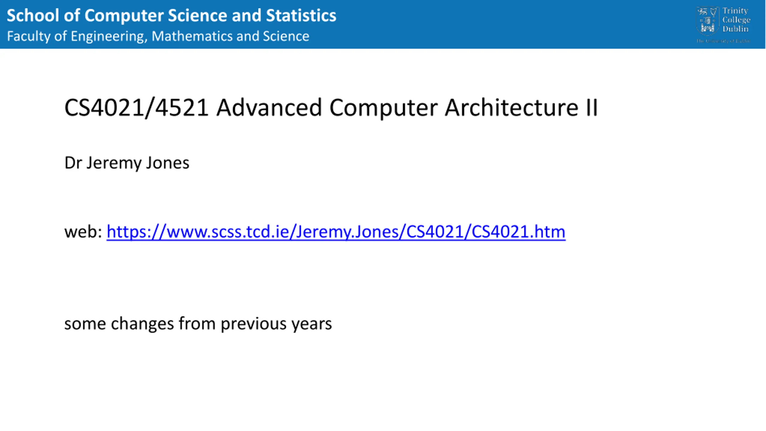 School of Computer Science and Statistics Faculty of Engineering, Mathematics and Science CS4021/4521 Advanced Computer Architecture II Dr Jeremy Jones web: https://www.scss.tcd.ie/Jeremy.Jones/CS4021/CS4021.htm some changes from previous years