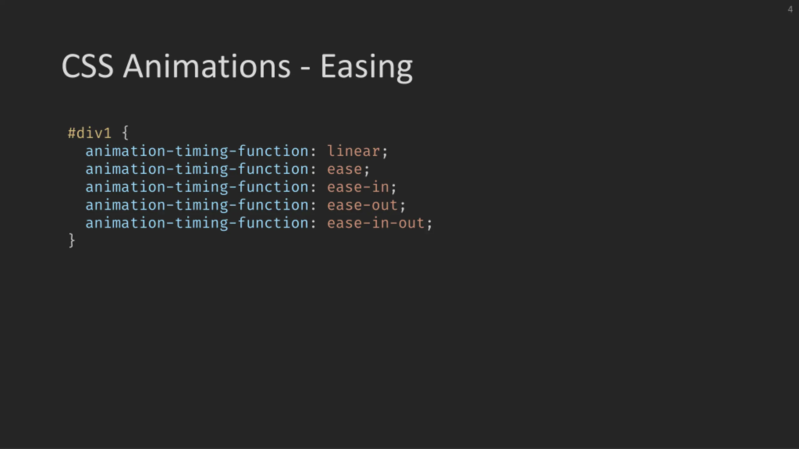 4 CSS Animations - Easing #div1 { animation-timing-function: linear; animation-timing-function: ease; animation-timing-function: ease-in; animation-timing-function: ease-out; animation-timing-function: ease-in-out; }