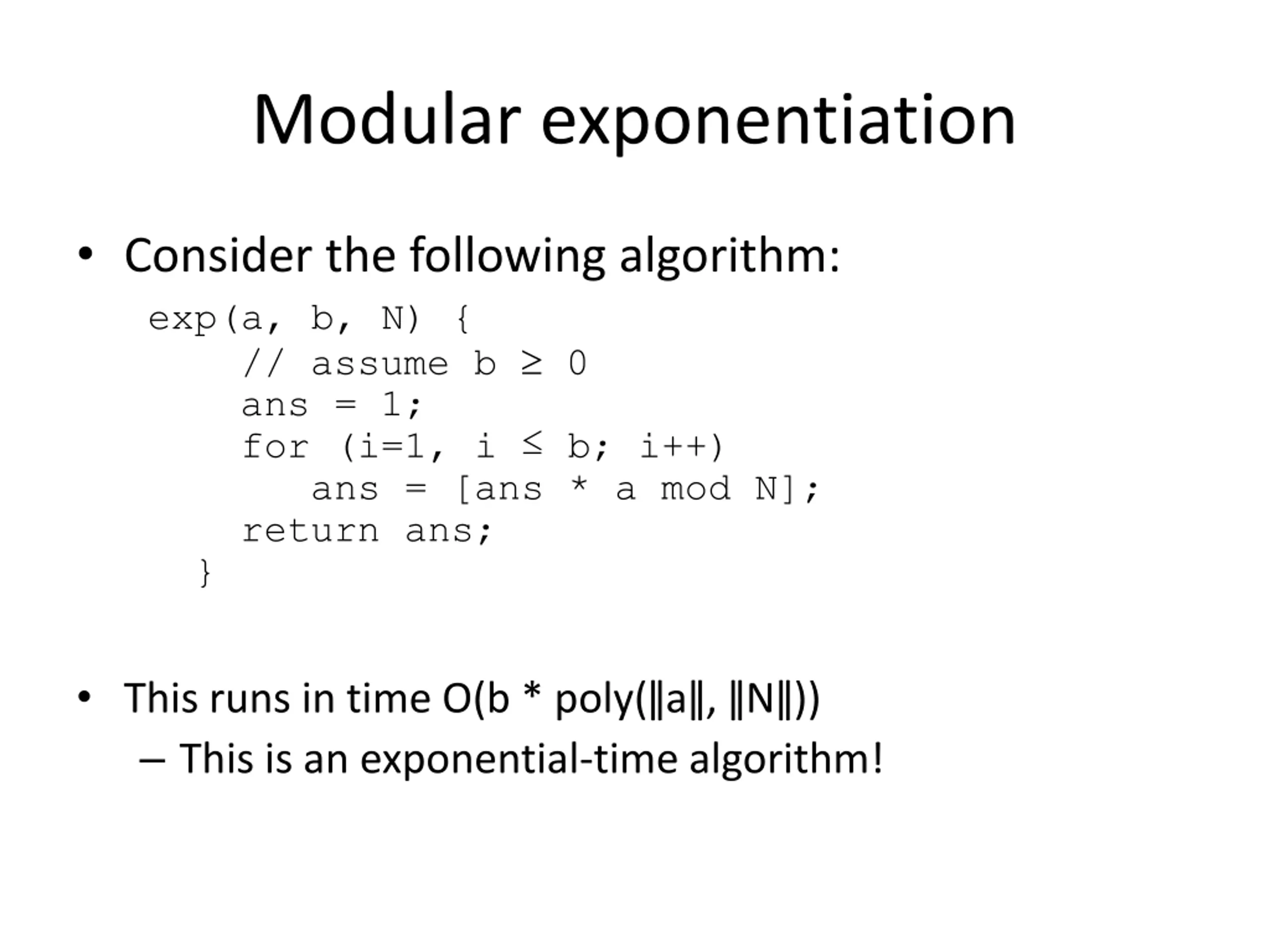 Modular exponentiation Consider the following algorithm: exp(a, b, N) { // assume b 0 ans = 1; for (i=1, i b; i++) ans = [ans * a mod N]; return ans; } This runs in time O(b * poly( a , N )) This is an exponential-time algorithm!