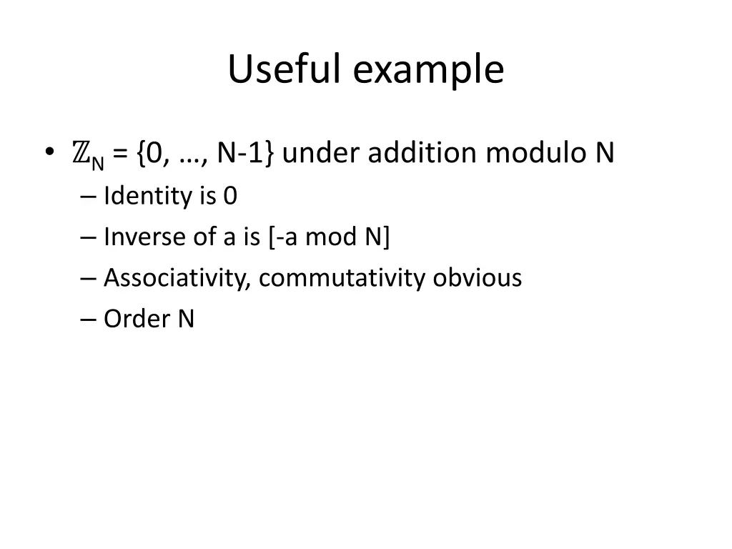 Useful example N= {0, , N-1} under addition modulo N Identity is 0 Inverse of a is [-a mod N] Associativity, commutativity obvious Order N