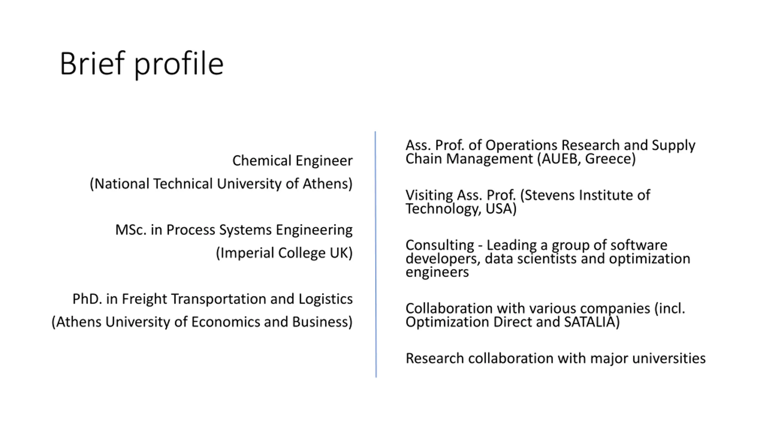 Brief profile Ass. Prof. of Operations Research and Supply Chain Management (AUEB, Greece) Chemical Engineer (National Technical University of Athens) Visiting Ass. Prof. (Stevens Institute of Technology, USA) MSc. in Process Systems Engineering (Imperial College UK) Consulting - Leading a group of software developers, data scientists and optimization engineers PhD. in Freight Transportation and Logistics (Athens University of Economics and Business) Collaboration with various companies (incl. Optimization Direct and SATALIA) Research collaboration with major universities