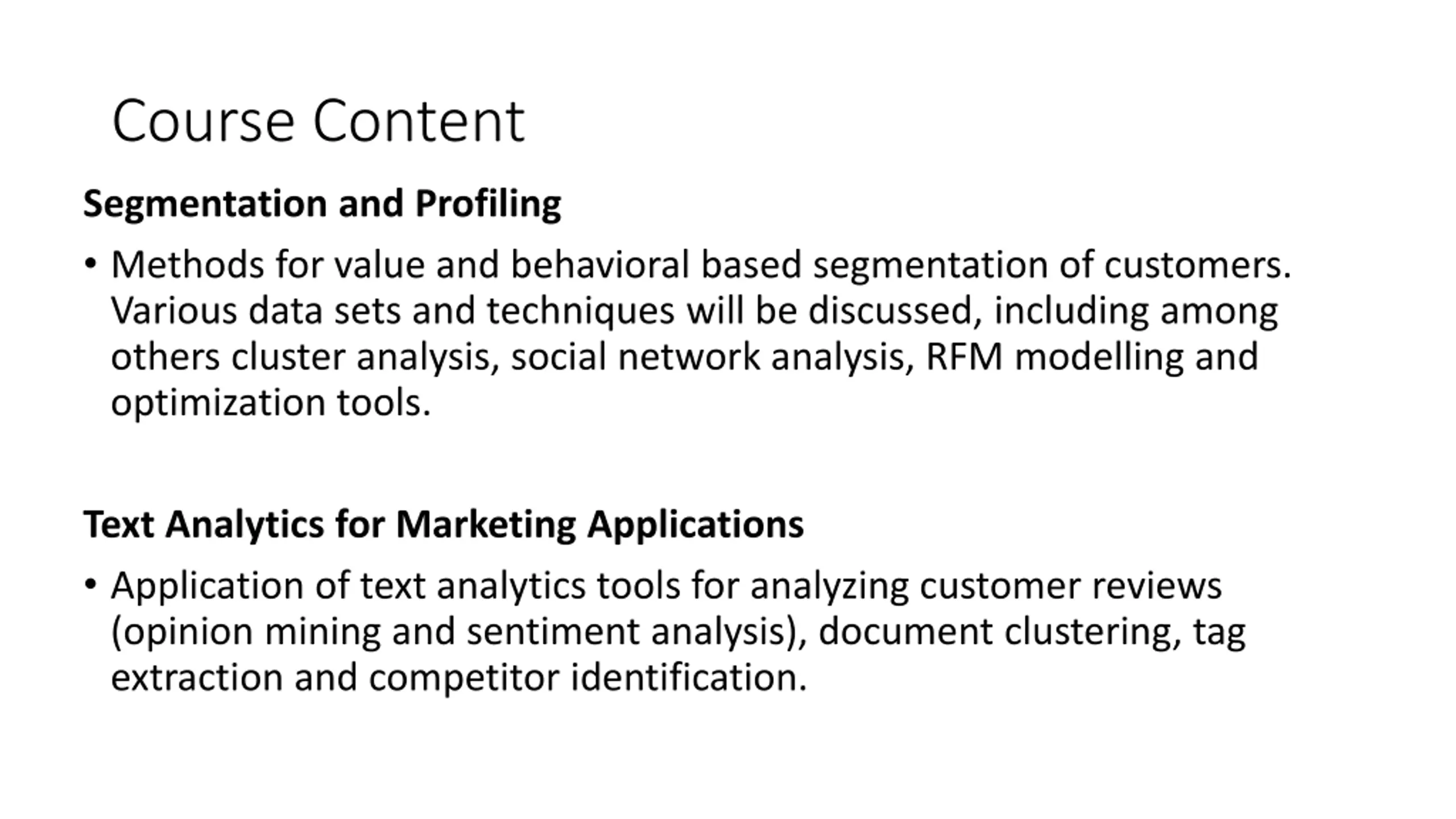 Course Content Segmentation and Profiling Methods for value and behavioral based segmentation of customers. Various data sets and techniques will be discussed, including among others cluster analysis, social network analysis, RFM modelling and optimization tools. Text Analytics for Marketing Applications Application of text analytics tools for analyzing customer reviews (opinion mining and sentiment analysis), document clustering, tag extraction and competitor identification.