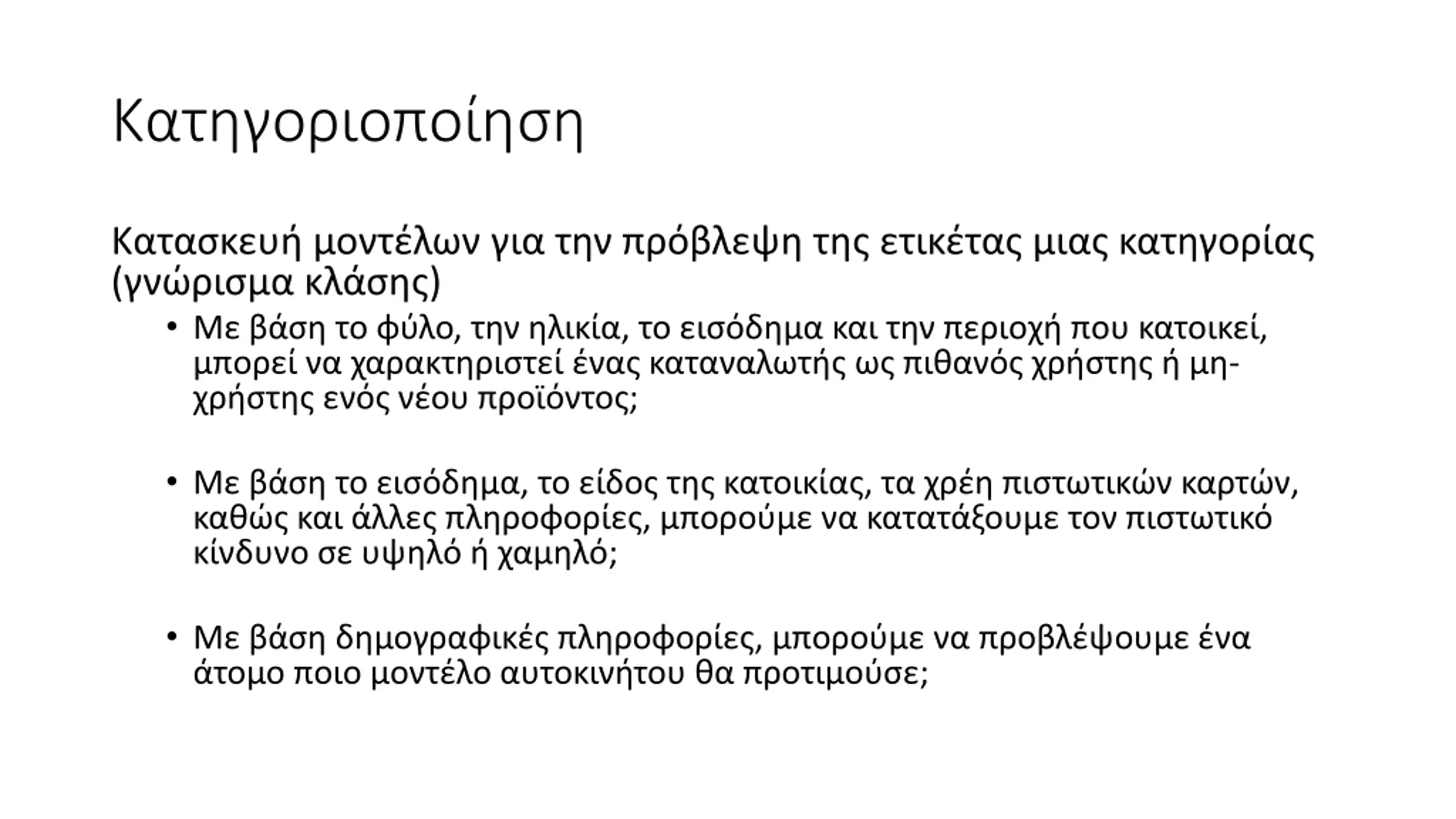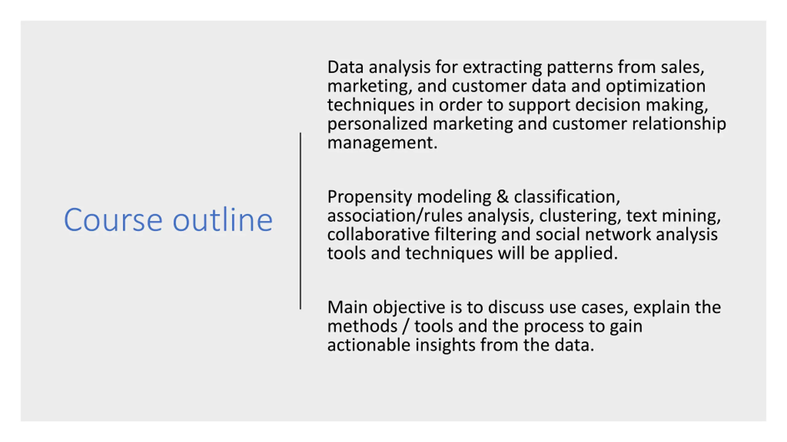 Data analysis for extracting patterns from sales, marketing, and customer data and optimization techniques in order to support decision making, personalized marketing and customer relationship management. Propensity modeling & classification, association/rules analysis, clustering, text mining, collaborative filtering and social network analysis tools and techniques will be applied. Course outline Main objective is to discuss use cases, explain the methods / tools and the process to gain actionable insights from the data.