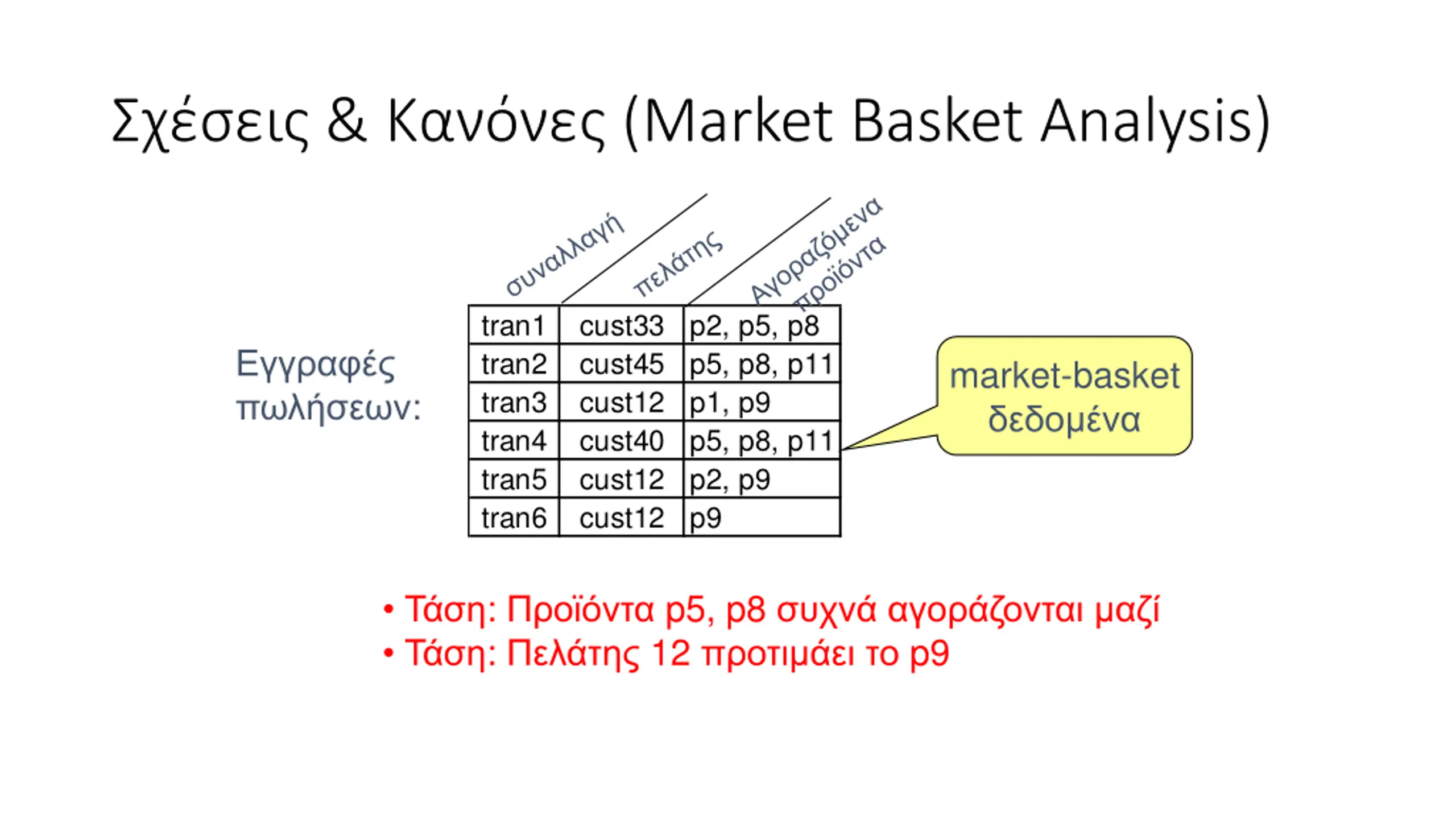 & (Market Basket Analysis) tran1 tran2 tran3 tran4 tran5 tran6 cust33 p2, p5, p8 cust45 p5, p8, p11 cust12 p1, p9 cust40 p5, p8, p11 cust12 p2, p9 cust12 p9 : market-basket : p5, p8 : 12 p9