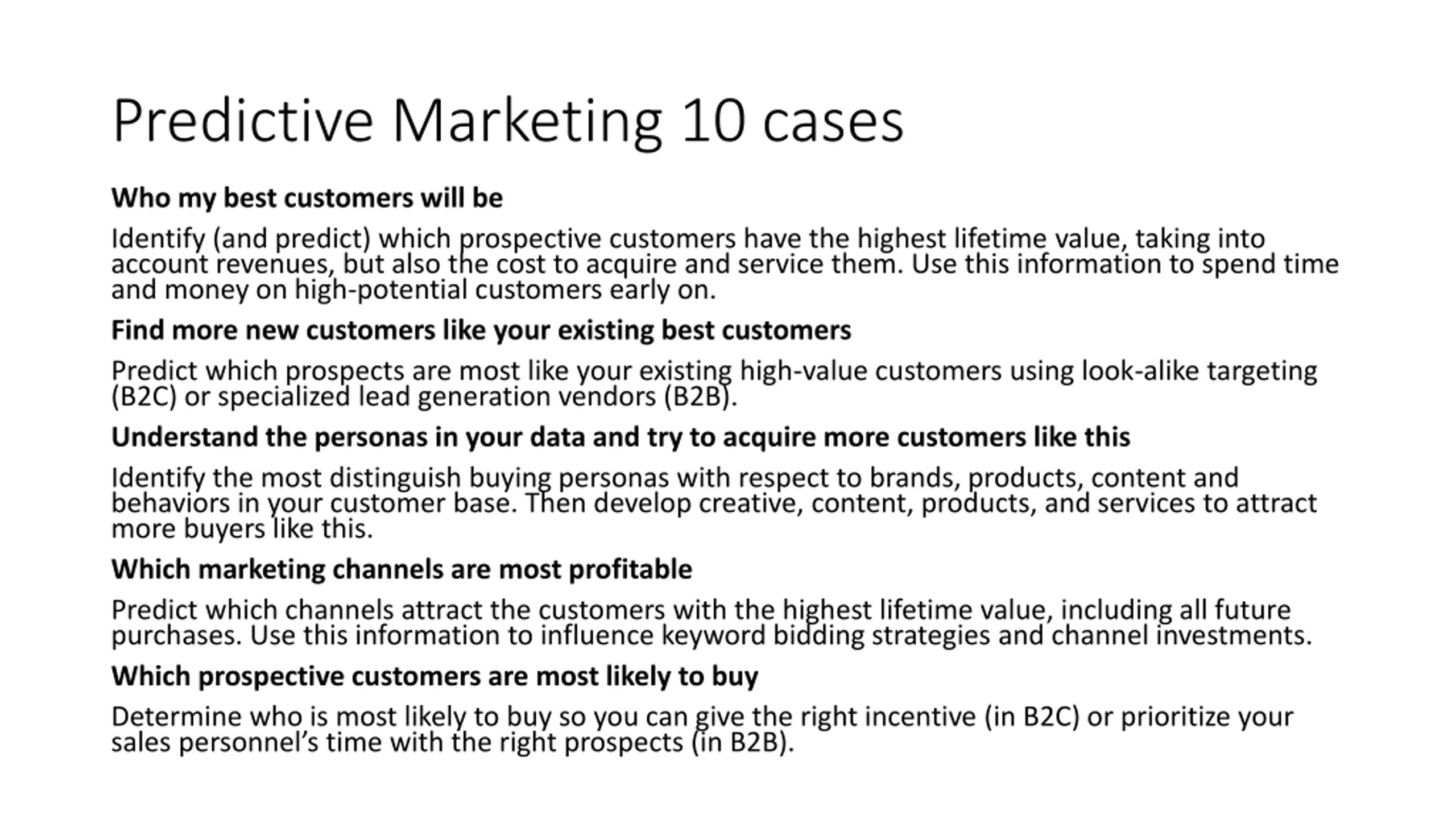 Predictive Marketing 10 cases Who my best customers will be Identify (and predict) which prospective customers have the highest lifetime value, taking into account revenues, but also the cost to acquire and service them. Use this information to spend time and money on high-potential customers early on. Find more new customers like your existing best customers Predict which prospects are most like your existing high-value customers using look-alike targeting (B2C) or specialized lead generation vendors (B2B). Understand the personas in your data and try to acquire more customers like this Identify the most distinguish buying personas with respect to brands, products, content and behaviors in your customer base. Then develop creative, content, products, and services to attract more buyers like this. Which marketing channels are most profitable Predict which channels attract the customers with the highest lifetime value, including all future purchases. Use this information to influence keyword bidding strategies and channel investments. Which prospective customers are most likely to buy Determine who is most likely to buy so you can give the right incentive (in B2C) or prioritize your sales personnel s time with the right prospects (in B2B).