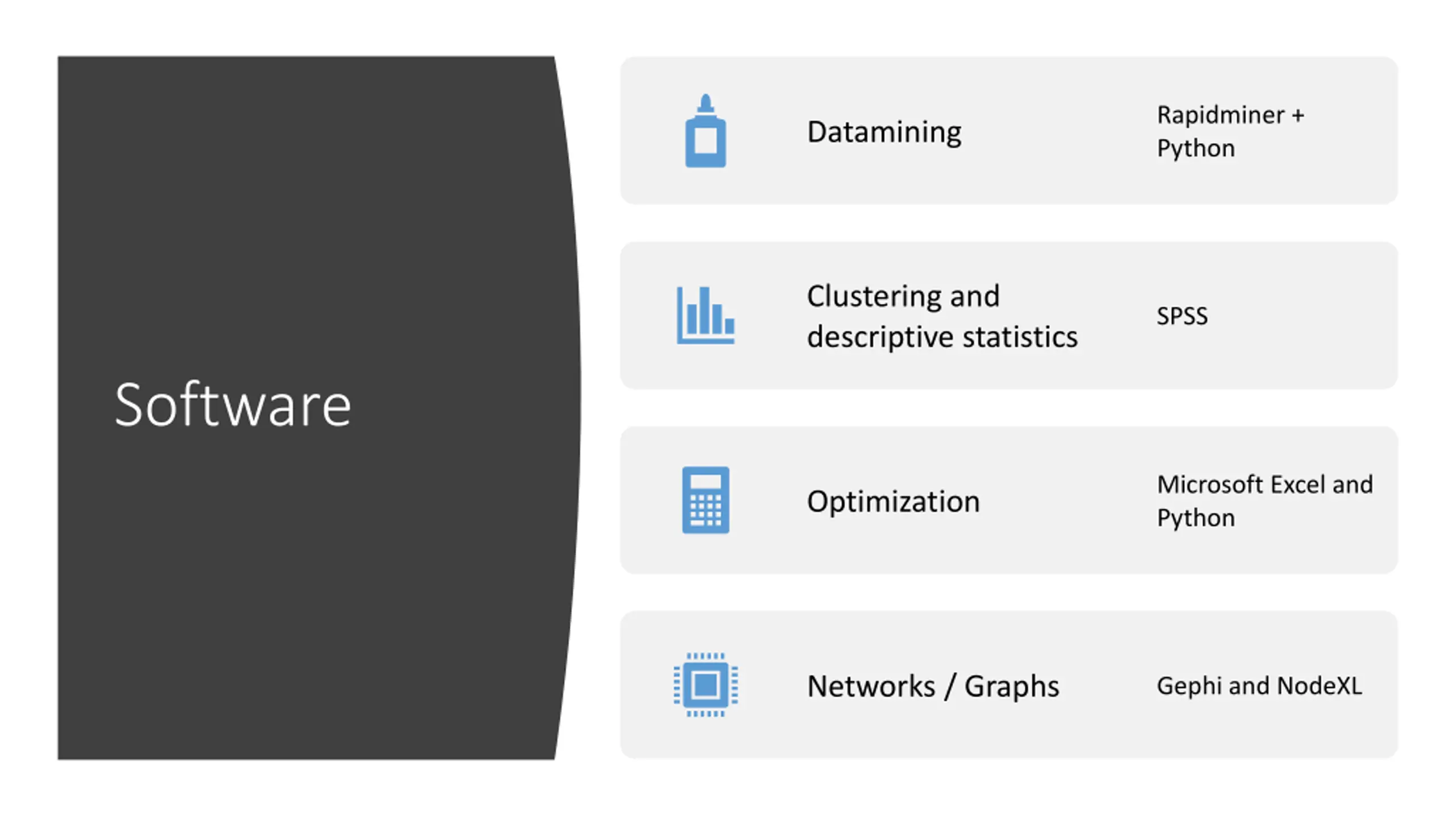 Rapidminer + Python Datamining Clustering and descriptive statistics SPSS Software Microsoft Excel and Python Optimization Networks / Graphs Gephi and NodeXL