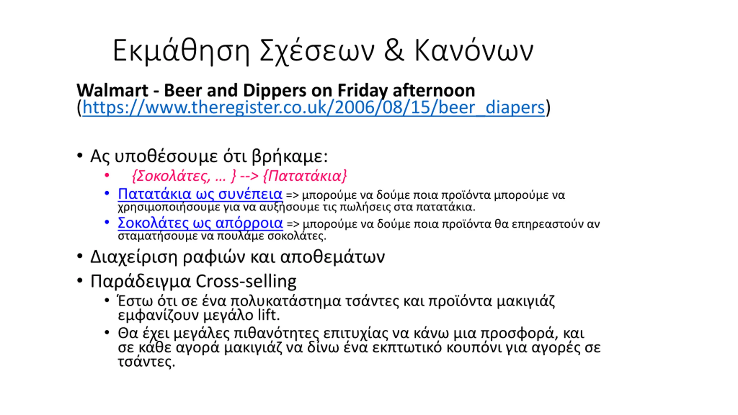 & Walmart - Beer and Dippers on Friday afternoon (https://www.theregister.co.uk/2006/08/15/beer_diapers) : { , } --> { } => . => . Cross-selling lift. , .
