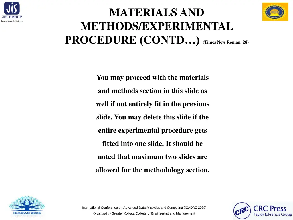 MATERIALS AND METHODS/EXPERIMENTAL PROCEDURE (CONTD ) (Times New Roman, 28) You may proceed with the materials and methods section in this slide as well if not entirely fit in the previous slide. You may delete this slide if the entire experimental procedure gets fitted into one slide. It should be noted that maximum two slides are allowed for the methodology section. International Conference on Advanced Data Analytics and Computing (ICADAC 2025) Organized by Greater Kolkata College of Engineering and Management
