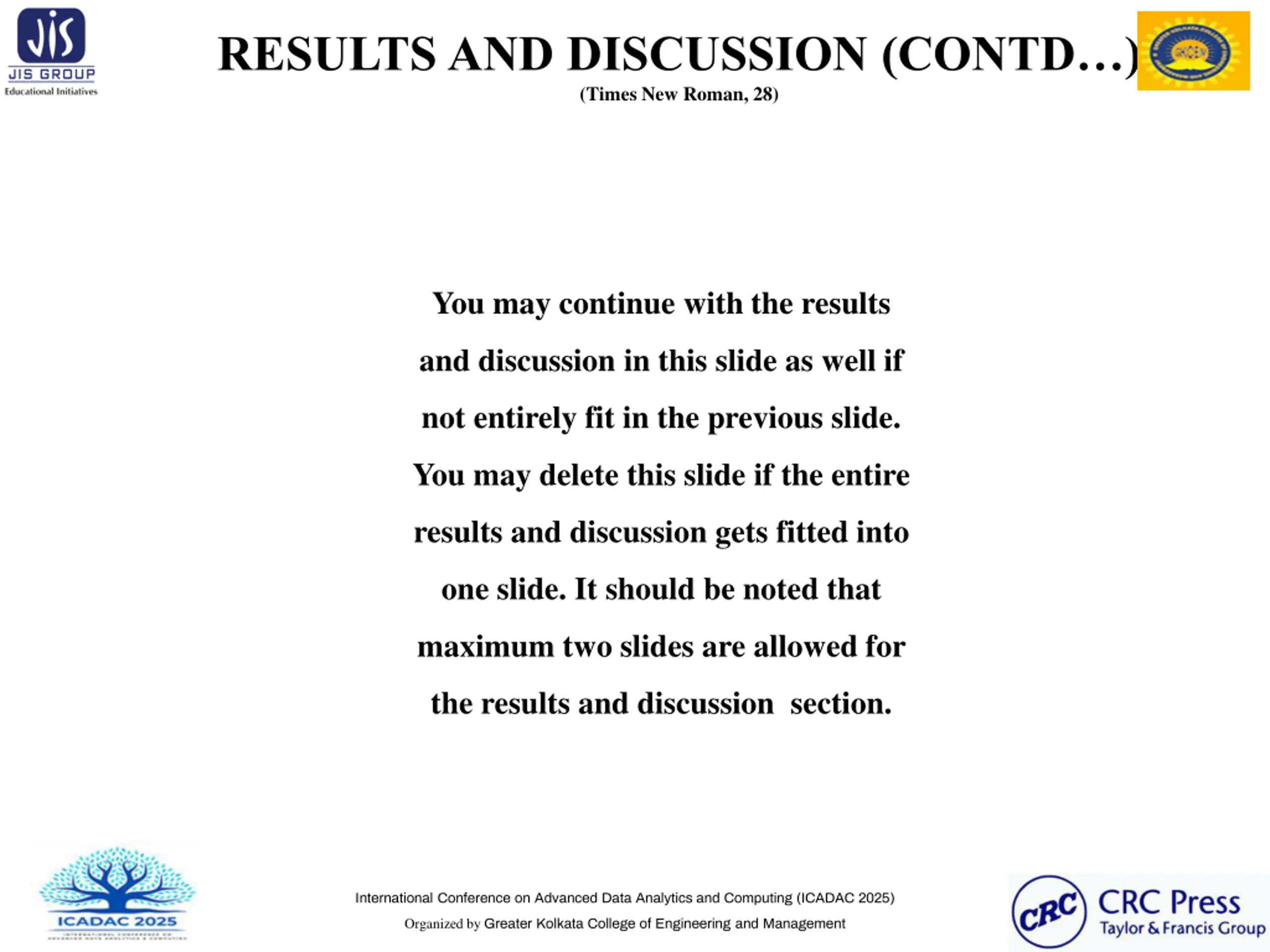 RESULTS AND DISCUSSION (CONTD) (Times New Roman, 28) You may continue with the results and discussion in this slide as well if not entirely fit in the previous slide. You may delete this slide if the entire results and discussion gets fitted into one slide. It should be noted that maximum two slides are allowed for the results and discussion section. International Conference on Advanced Data Analytics and Computing (ICADAC 2025) Organized by Greater Kolkata College of Engineering and Management