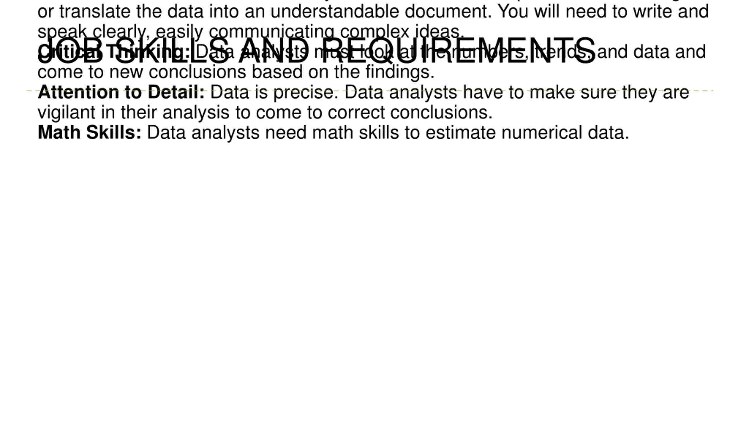Data analysts are often called to present their findings, or translate the data into an understandable document. You will need to write and speak clearly, easily communicating complex ideas. Critical Thinking: Data analysts must look at the numbers, trends, and data and JOB SKILLS AND REQUIREMENTS come to new conclusions based on the findings. Attention to Detail: Data is precise. Data analysts have to make sure they are vigilant in their analysis to come to correct conclusions. Math Skills: Data analysts need math skills to estimate numerical data.