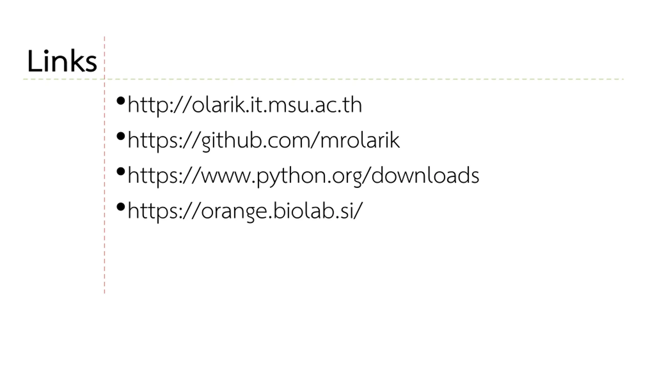 Links http://olarik.it.msu.ac.th https://github.com/mrolarik https://www.python.org/downloads https://orange.biolab.si/
