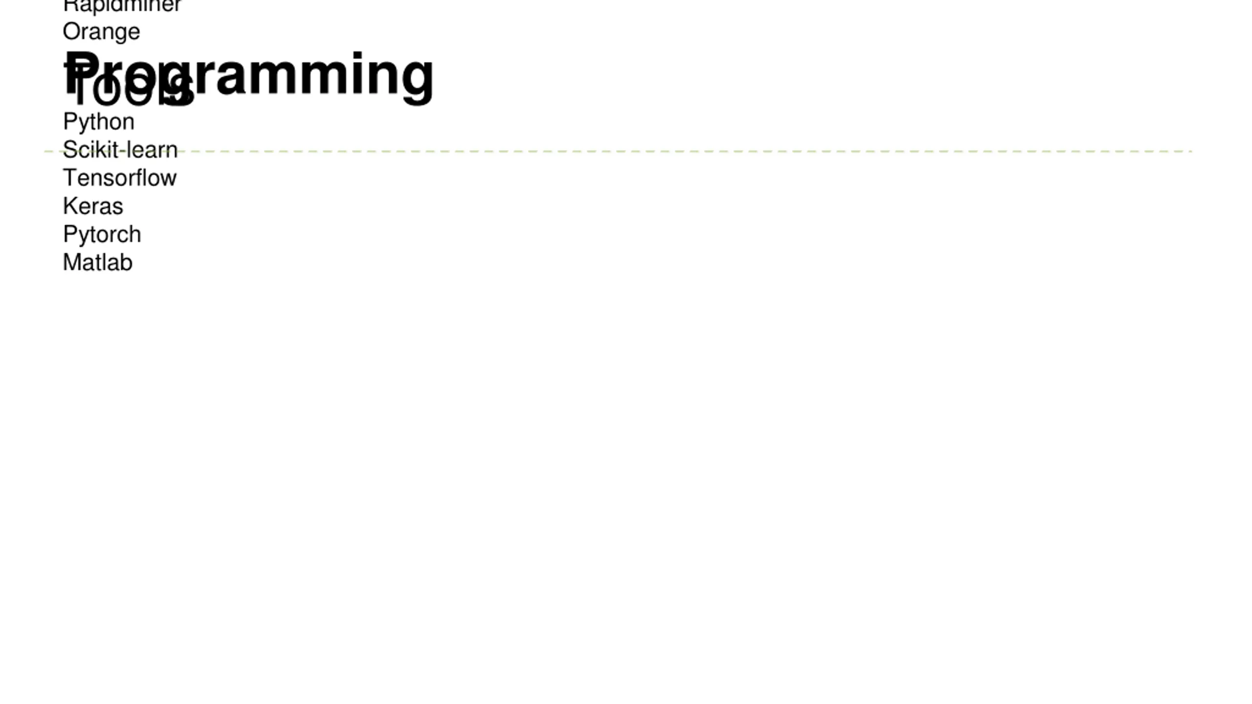 Rapidminer Orange Tools Programming Python Scikit-learn Tensorflow Keras Pytorch Matlab