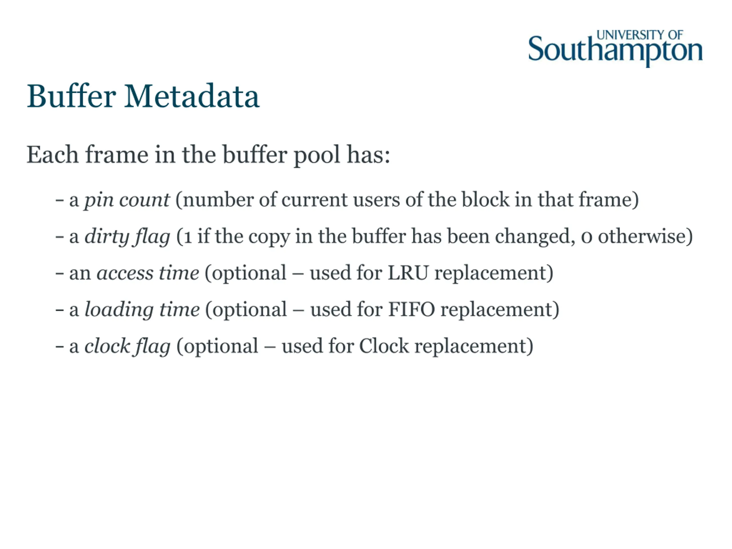 Buffer Metadata Each frame in the buffer pool has: a pin count (number of current users of the block in that frame) a dirty flag (1 if the copy in the buffer has been changed, 0 otherwise) an access time (optional used for LRU replacement) a loading time (optional used for FIFO replacement) a clock flag (optional used for Clock replacement)