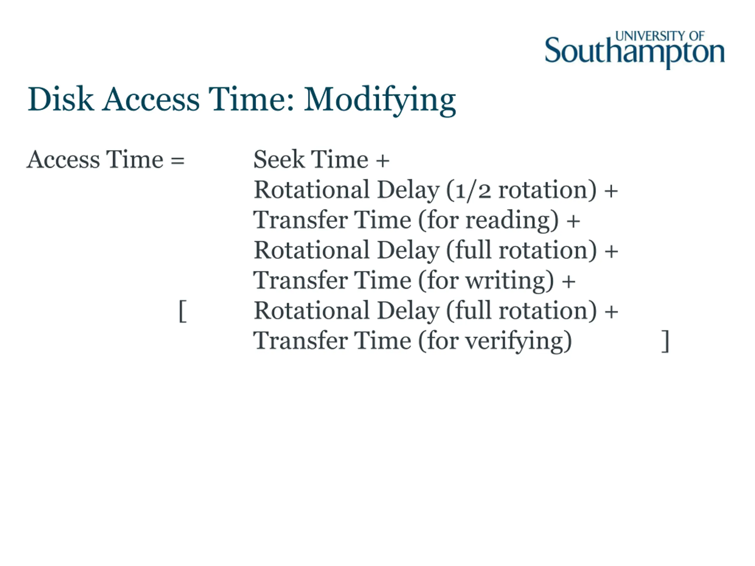 Disk Access Time: Modifying Access Time = Seek Time + Rotational Delay (1/2 rotation) + Transfer Time (for reading) + Rotational Delay (full rotation) + Transfer Time (for writing) + Rotational Delay (full rotation) + Transfer Time (for verifying) [ ]