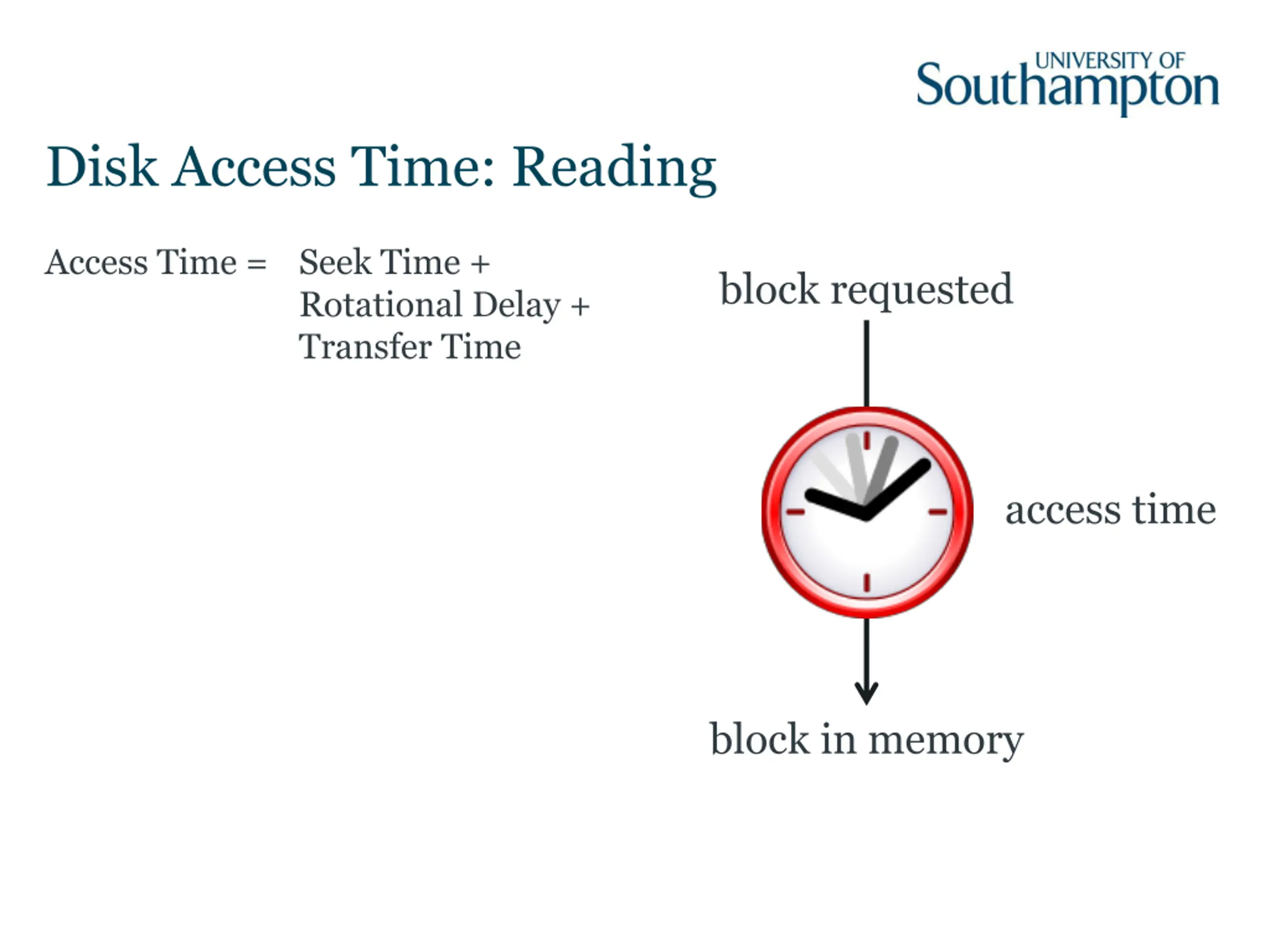 Disk Access Time: Writing Costs similar to those for reading, unless we wish to verify data Verifying requires that we read the block we ve just written Access Time = Seek Time + Rotational Delay (1/2 rotation) + Transfer Time (for writing) + Rotational Delay (full rotation) + Transfer Time (for verifying)