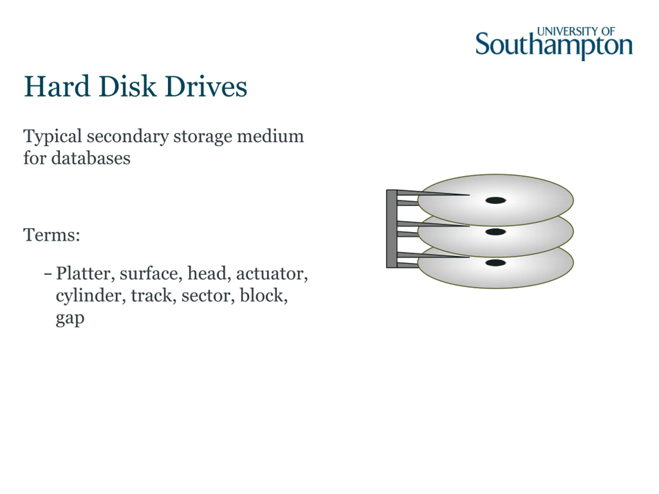 Hard Disk Drives Typical secondary storage medium for databases Terms: -Platter, surface, head, actuator, cylinder, track, sector, block, gap