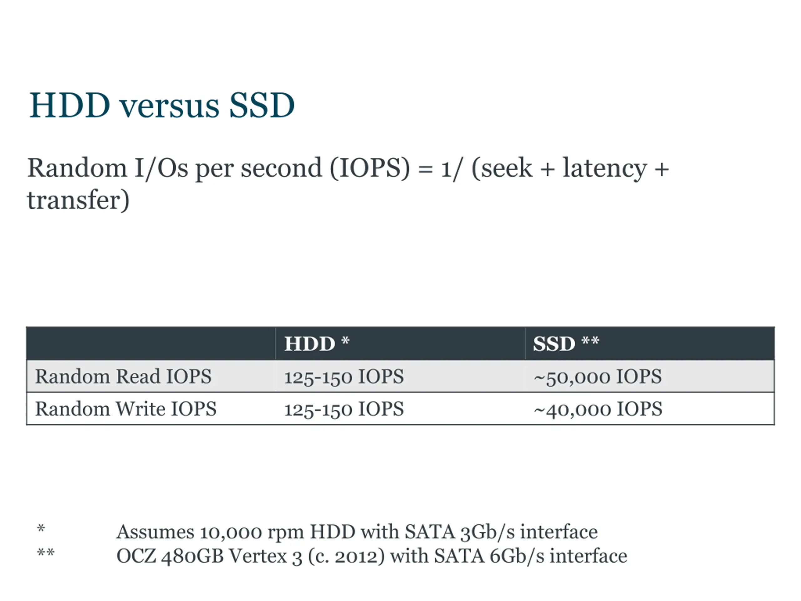 HDD versus SSD Random I/Os per second (IOPS) = 1/ (seek + latency + transfer) HDD * 125-150 IOPS 125-150 IOPS SSD ** ~50,000 IOPS ~40,000 IOPS Random Read IOPS Random Write IOPS * ** Assumes 10,000 rpm HDD with SATA 3Gb/s interface OCZ 480GB Vertex 3 (c. 2012) with SATA 6Gb/s interface