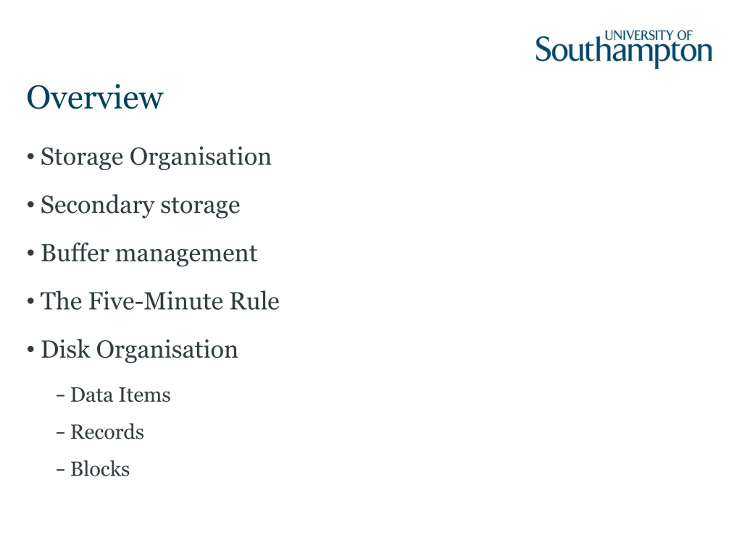 Overview Storage Organisation Secondary storage Buffer management The Five-Minute Rule Disk Organisation Data Items Records Blocks