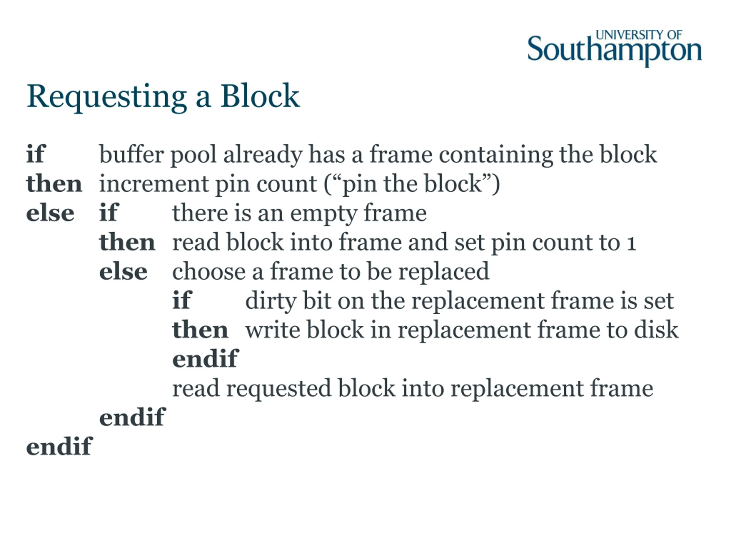 Requesting a Block if thenincrement pin count ( pin the block ) elseif there is an empty frame then read block into frame and set pin count to 1 else choose a frame to be replaced if dirty bit on the replacement frame is set then write block in replacement frame to disk endif read requested block into replacement frame endif endif buffer pool already has a frame containing the block