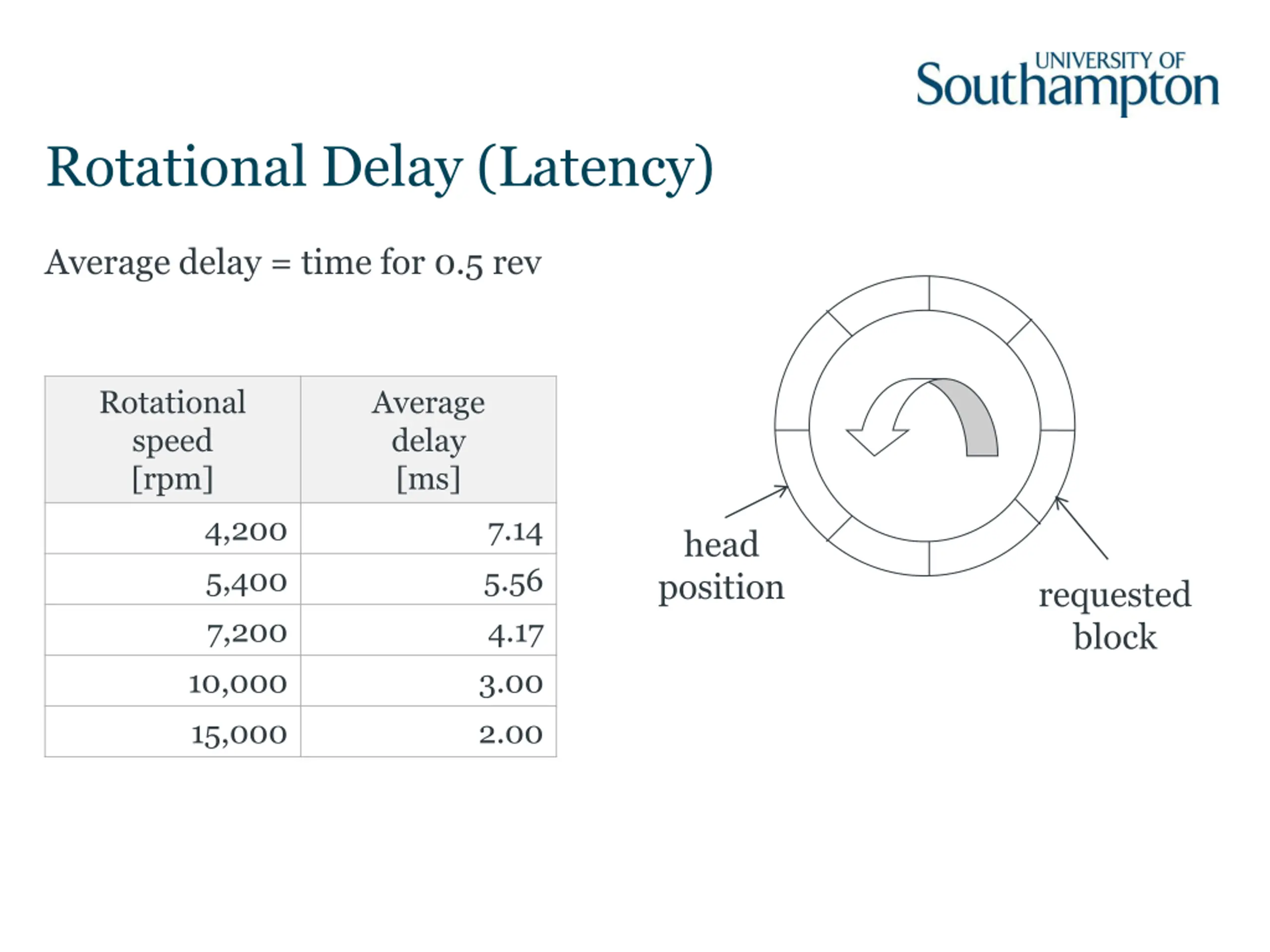 Rotational Delay (Latency) Average delay = time for 0.5 rev Rotational speed [rpm] Average delay [ms] 4,200 5,400 7,200 10,000 15,000 7.14 5.56 4.17 3.00 2.00 head position requested block