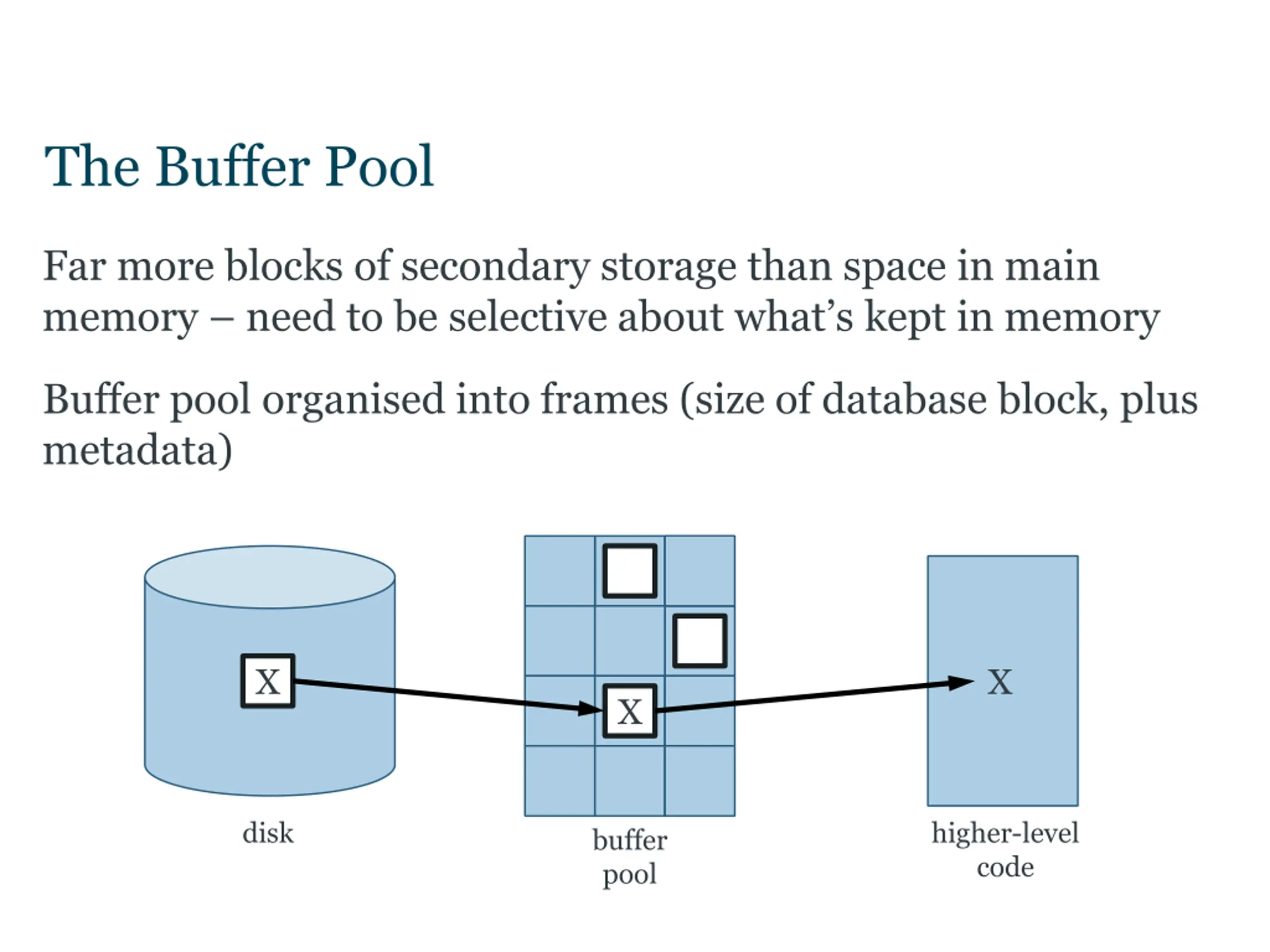 The Buffer Pool Far more blocks of secondary storage than space in main memory need to be selective about what s kept in memory Buffer pool organised into frames (size of database block, plus metadata) X X X disk higher-level code buffer pool