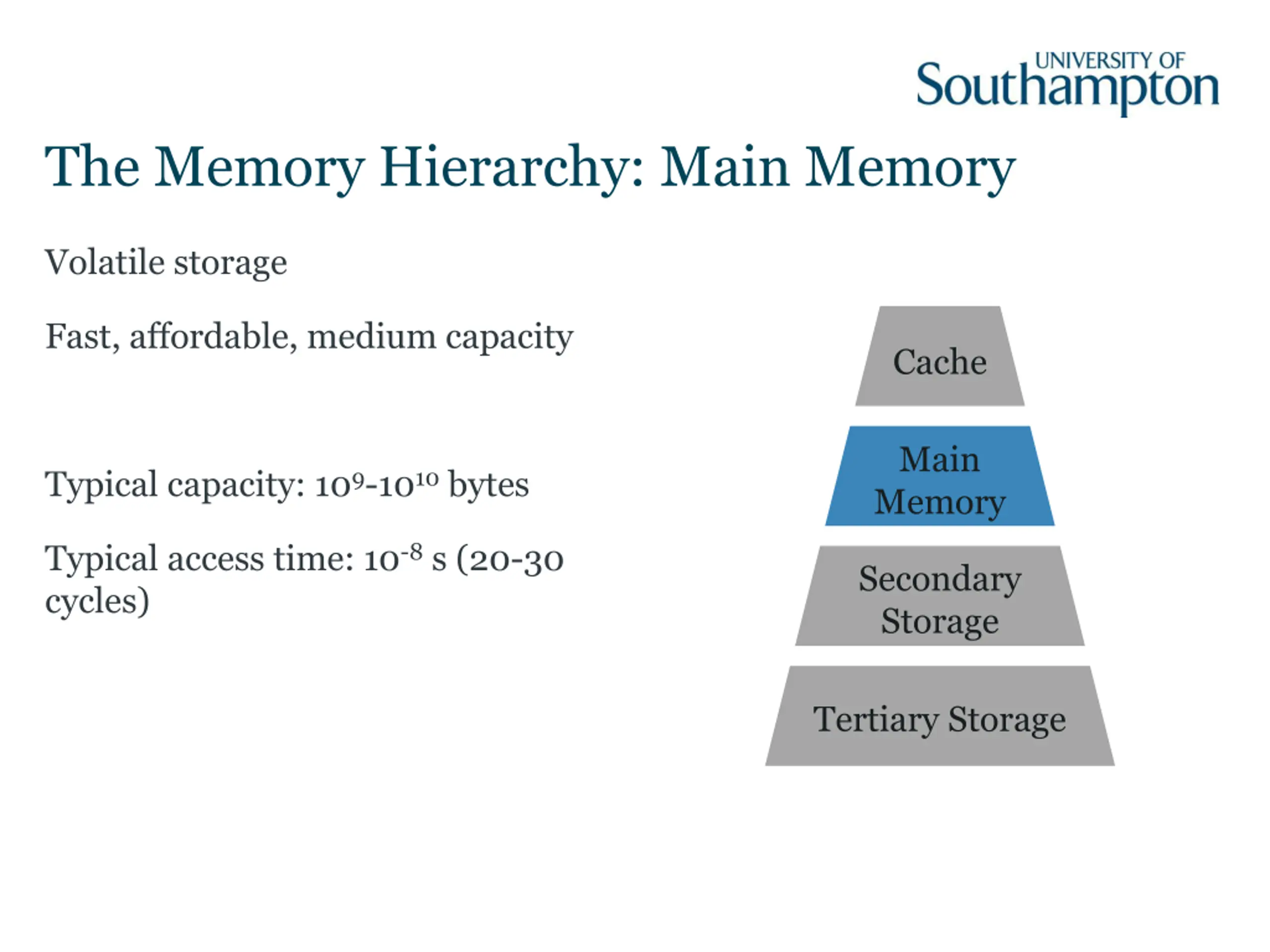 The Memory Hierarchy: Main Memory Volatile storage Fast, affordable, medium capacity Cache Main Memory Typical capacity: 109-1010 bytes Typical access time: 10-8 s (20-30 cycles) Secondary Storage Tertiary Storage