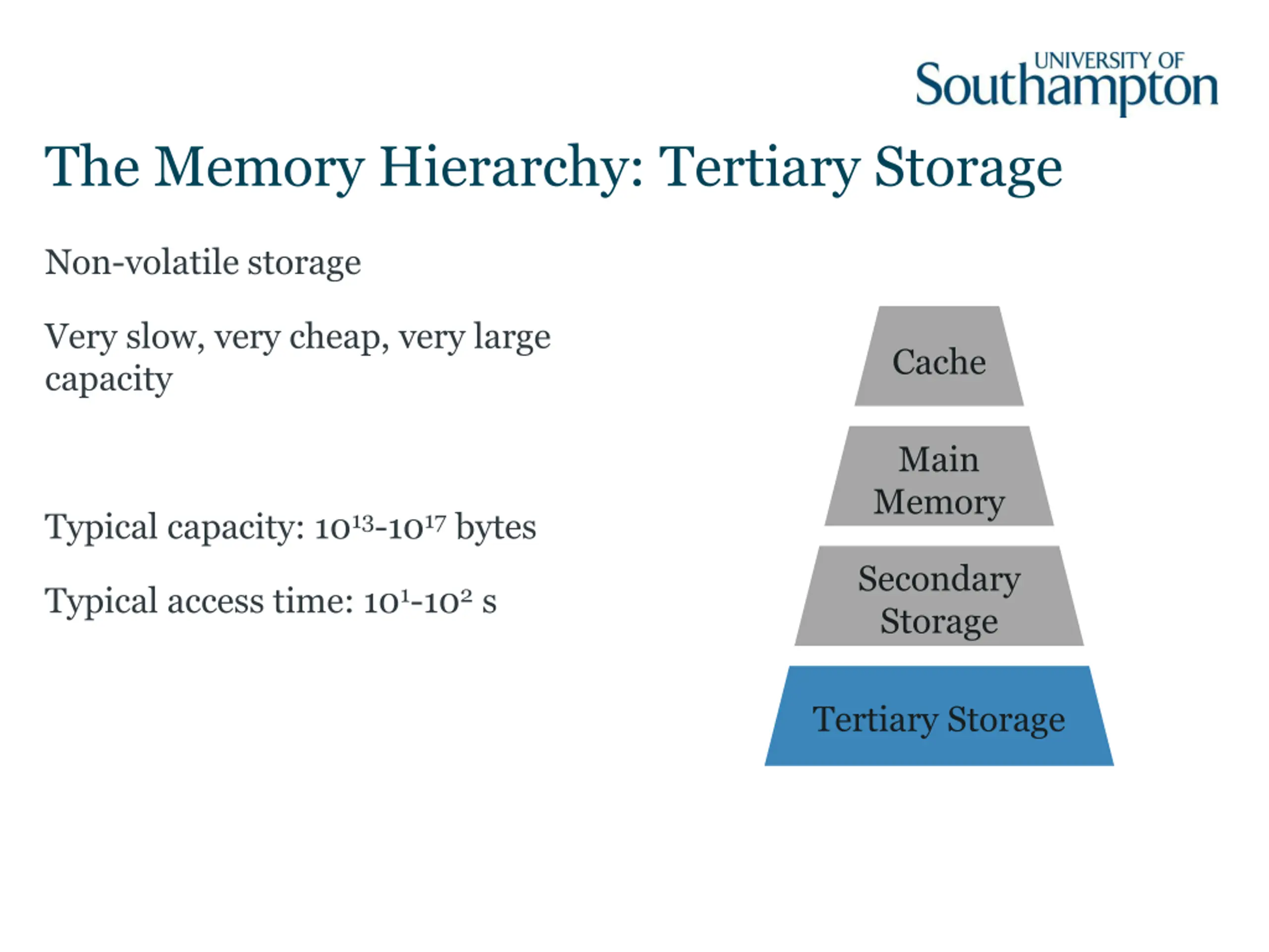 The Memory Hierarchy: Tertiary Storage Non-volatile storage Very slow, very cheap, very large capacity Cache Main Memory Typical capacity: 1013-1017 bytes Secondary Storage Typical access time: 101-102 s Tertiary Storage